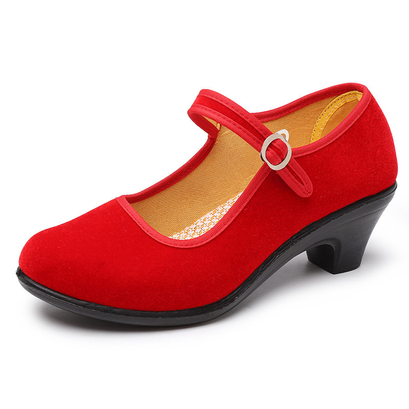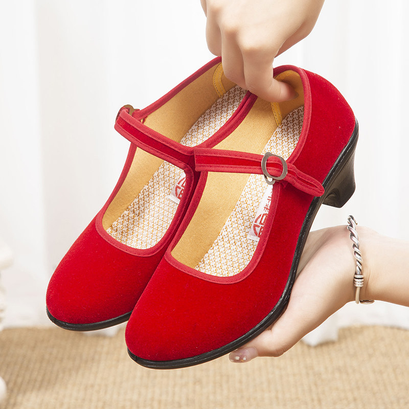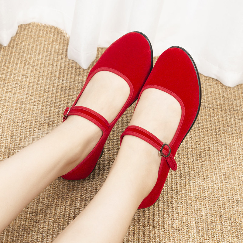 天猫大红色老北京布鞋女单鞋表演礼仪广场舞红色高跟鞋一字扣带妈妈鞋