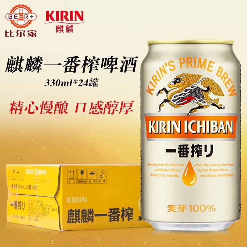 日本KIRIN麒麟啤酒“一番榨”日式生啤精选优质麦芽,采用独特“一番榨”工艺,仅使用每粒麦芽首次压榨的麦汁酿造,确保酒体纯净、口感清爽。本品包含500ml×24罐与330ml×24罐两种规格,满足不同饮用场景需求。酒液呈明亮金黄色,泡沫细腻持久,入口顺滑,麦香浓郁,苦味适中,回味干净利落,完美呈现日式生啤的精致风味。无论是搭配日式料理、烧烤,还是日常小酌,都能带来清爽愉悦的体验。麒麟啤酒百年匠心工艺,品质值得信赖,是追求高品质啤酒爱好者的理想之选。