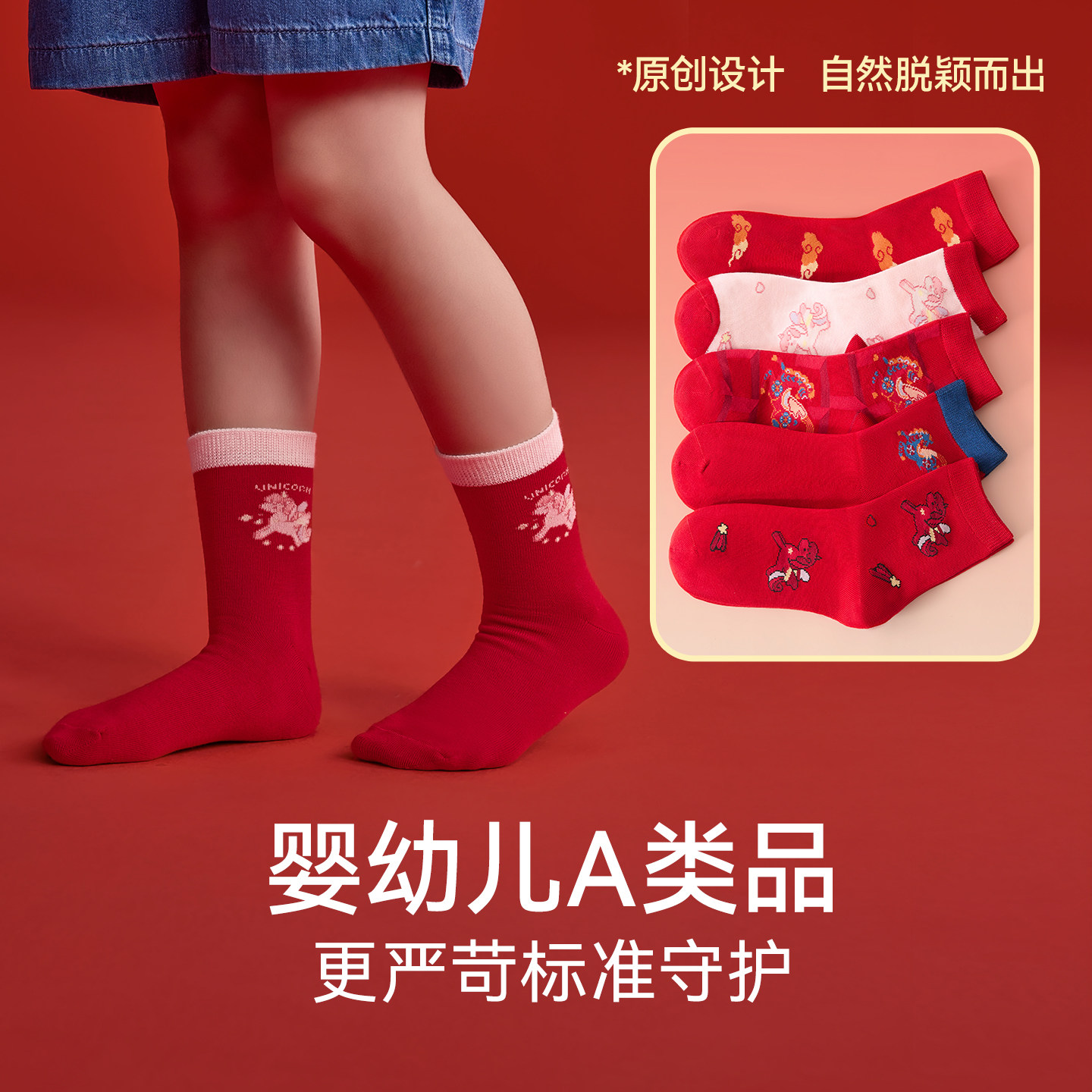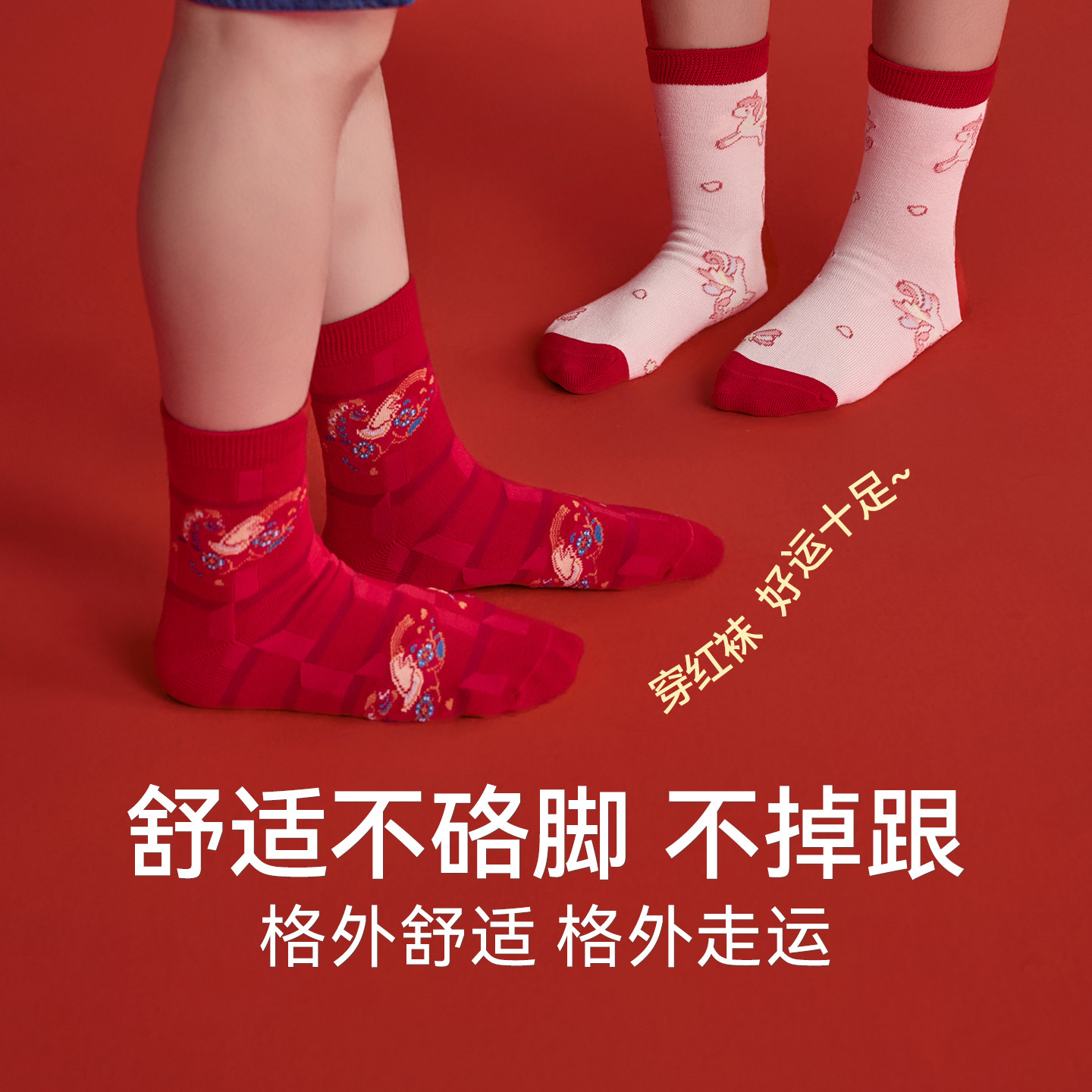 天猫红豆儿童本命年红色袜子男童女童马年中筒袜新年大红休闲棉袜秋冬