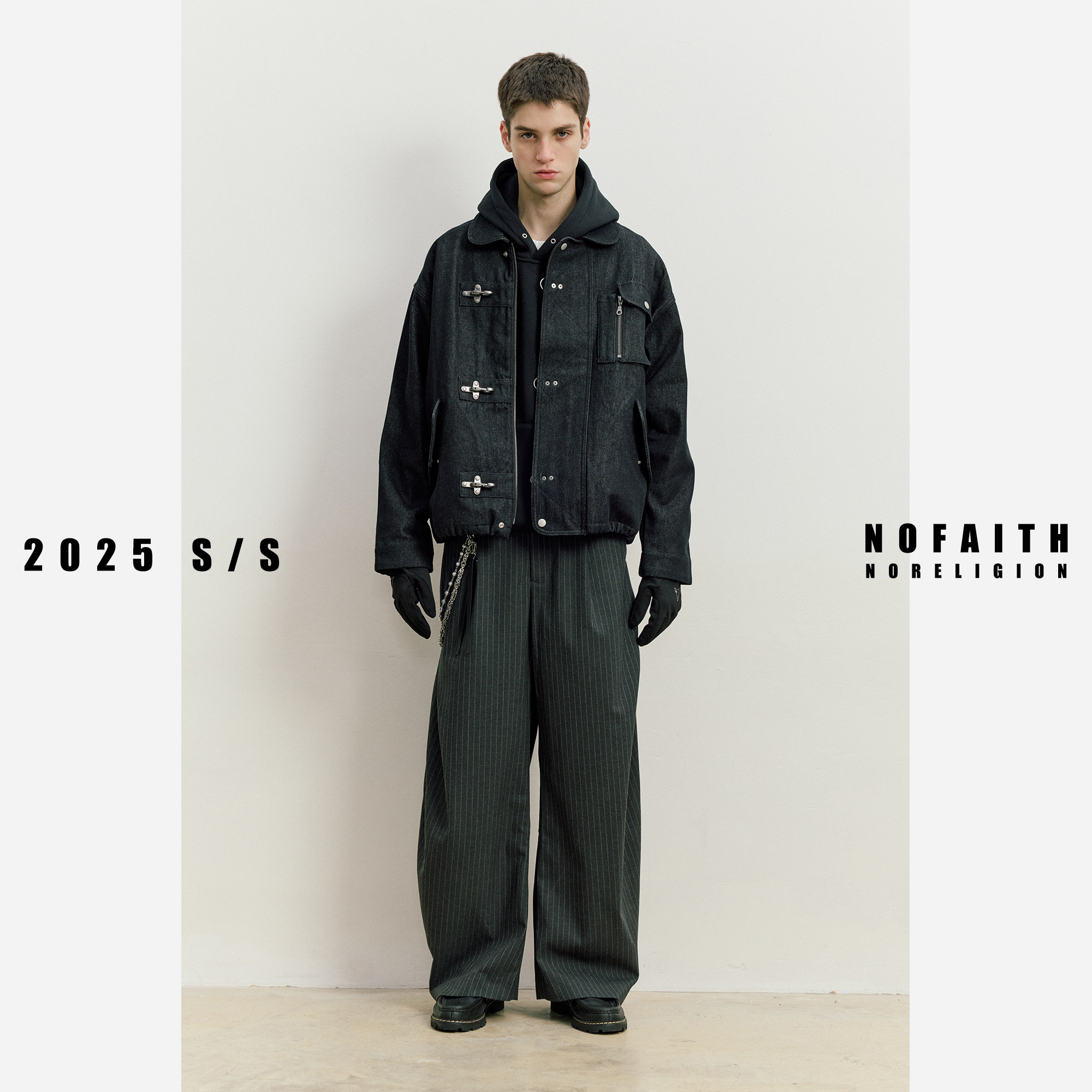 淘宝NOFAITH轻薄复古弯刀裤竖条纹西裤男垂顺抗皱宽松通勤休闲长裤