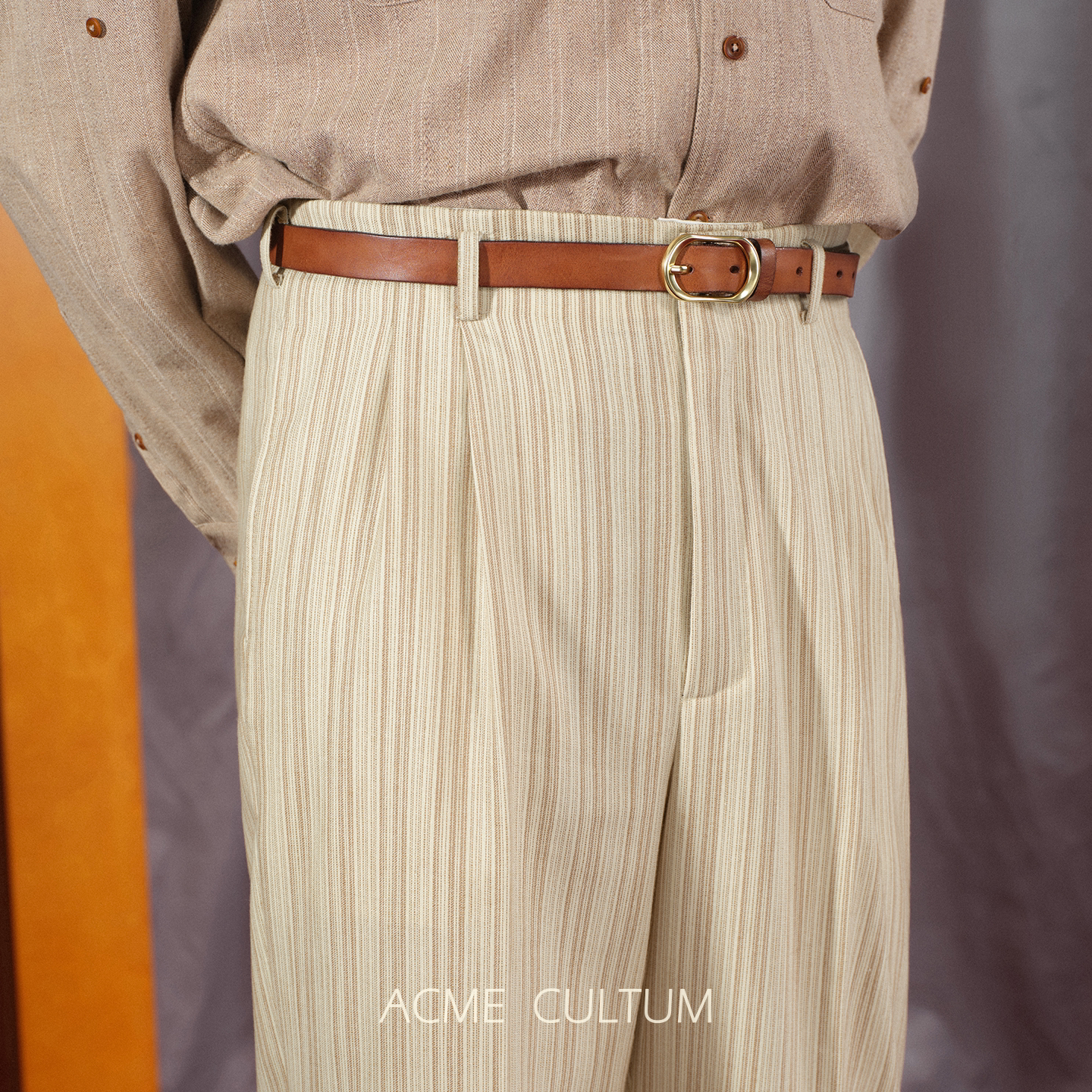 Acmecultum羊毛双褶直筒条纹好莱坞连腰西裤,融合经典老钱风与现代休闲美学,精选优质羊毛面料,保暖挺括,适合秋冬季节。双褶设计提升穿着舒适度,直筒剪裁修饰腿型,彰显优雅从容气质。经典条纹元素搭配连腰结构,细节精致,复古中透出高级感。无论是搭配针织衫打造低调奢华的日常造型,还是配以衬衫演绎职场雅痞风格,皆能轻松驾驭。兼具舒适性与设计感,是追求质感与品位的男士衣橱中不可或缺的单品,诠释 timeless 的绅士风范。