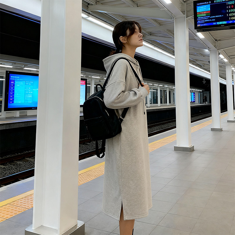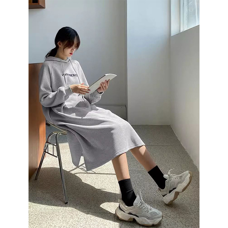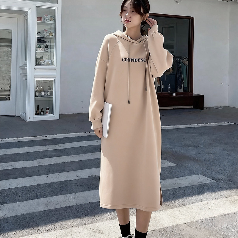 天孕妇装过膝中长款纯棉连帽卫衣裙秋冬宽松韩范chic抽绳连帽百搭裙
