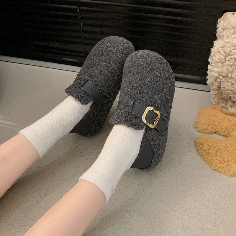 淘宝韩版勃肯鞋女毛呢皮带扣单鞋百搭厚底圆头青年鞋