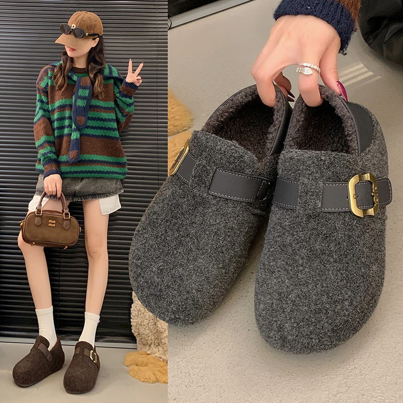 淘毛毛勃肯鞋厚底懒人一脚蹬加绒棉拖鞋保暖复古2024新款日系包头拖