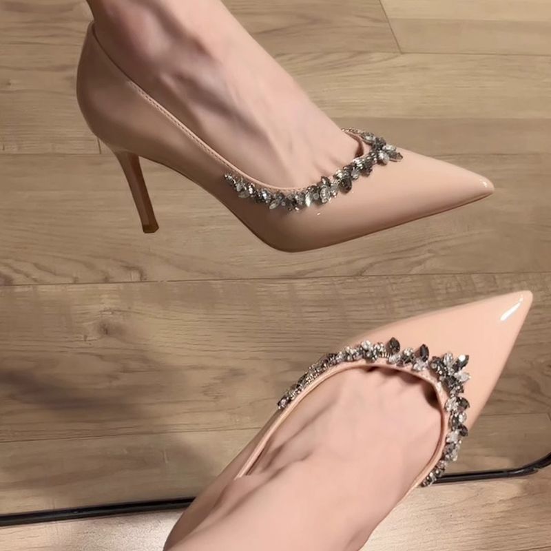淘宝气质细跟脚风仙女婚鞋浅口水钻高跟鞋新款2024不累单鞋裸色尖头女
