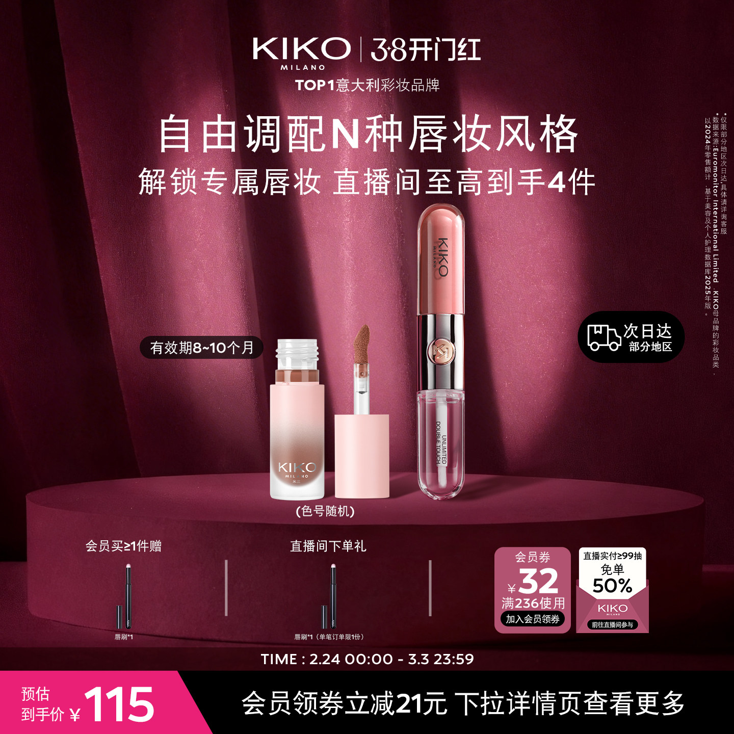 【立即抢购】意大利KIKO双头唇釉,打造持久镜面美唇!创新双头设计,一端浓郁唇釉,一端透明唇蜜,轻松叠加出立体饱满的果冻唇效。精选裸色系列,自然提亮气色,适合日常通勤与约会妆容。独特成膜技术,上唇迅速贴合,不掉色、不沾杯,持久锁色长达8小时。轻盈水润质地,不粘腻、不拔干,呵护娇嫩双唇。意大利原装进口,品质保障,性价比超高。无论是单独使用或搭配叠涂,都能轻松驾驭多种风格。现在下单,立享限时优惠,打造属于你的高级感唇妆,心动不如行动,立即抢购!