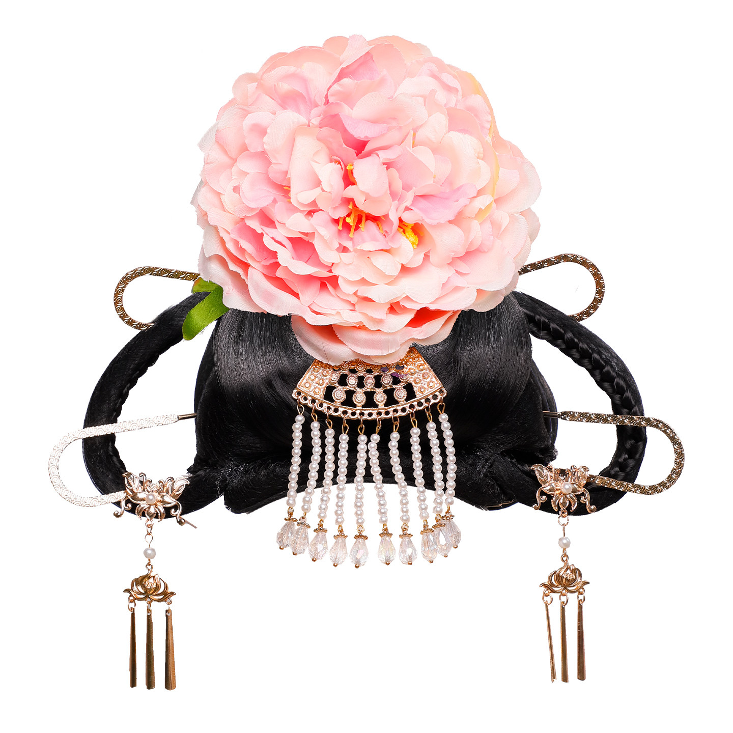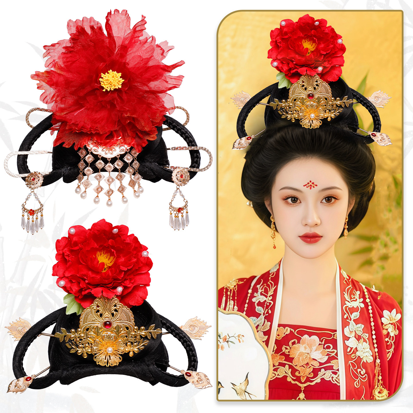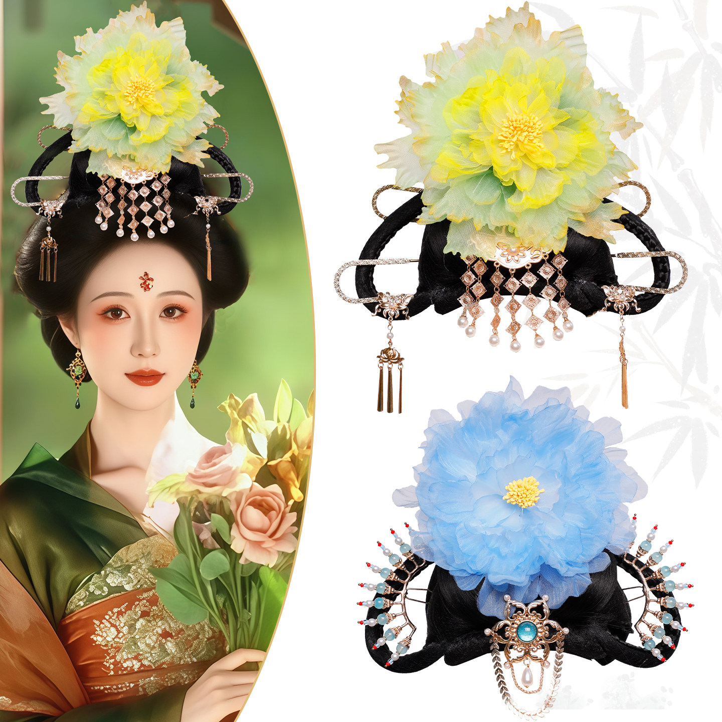 唐朝宫廷风发饰以华美典雅著称,多采用轻盈飘逸的多色绢纱制成精致花朵,搭配鎏金或彩绘花蕊,色彩绚丽、层次分明,尽显盛唐雍容气韵。此套发夹配饰专为复原唐代贵妃、公主造型而设计,包含多枚立体绢花发夹与同款假发髻组合,可灵活搭配高髻、堕马髻等经典发型。材质考究,工艺细腻,既保留传统韵味,又兼顾现代佩戴舒适感。无论是汉服爱好者、舞台演出,还是古风摄影,皆能轻松营造“云鬓花颜金步摇”的盛世风华,重现大唐宫廷的绝代风华与贵族雅致。