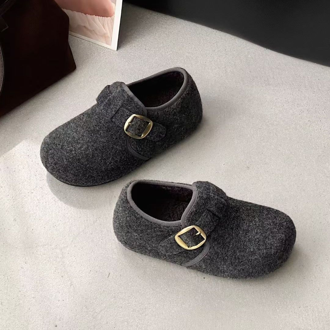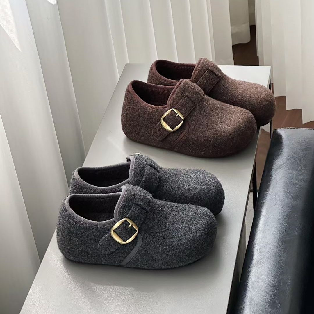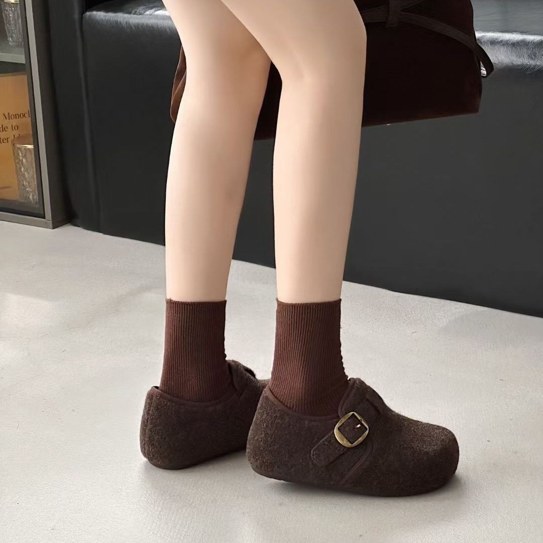 韩版勃肯鞋女毛呢皮带扣单鞋百搭厚底圆头青年鞋