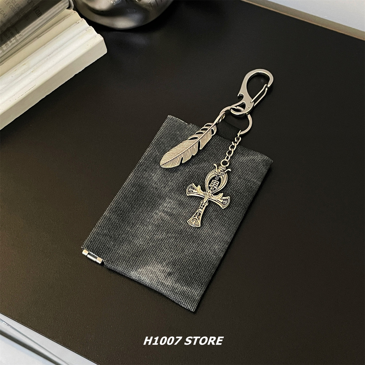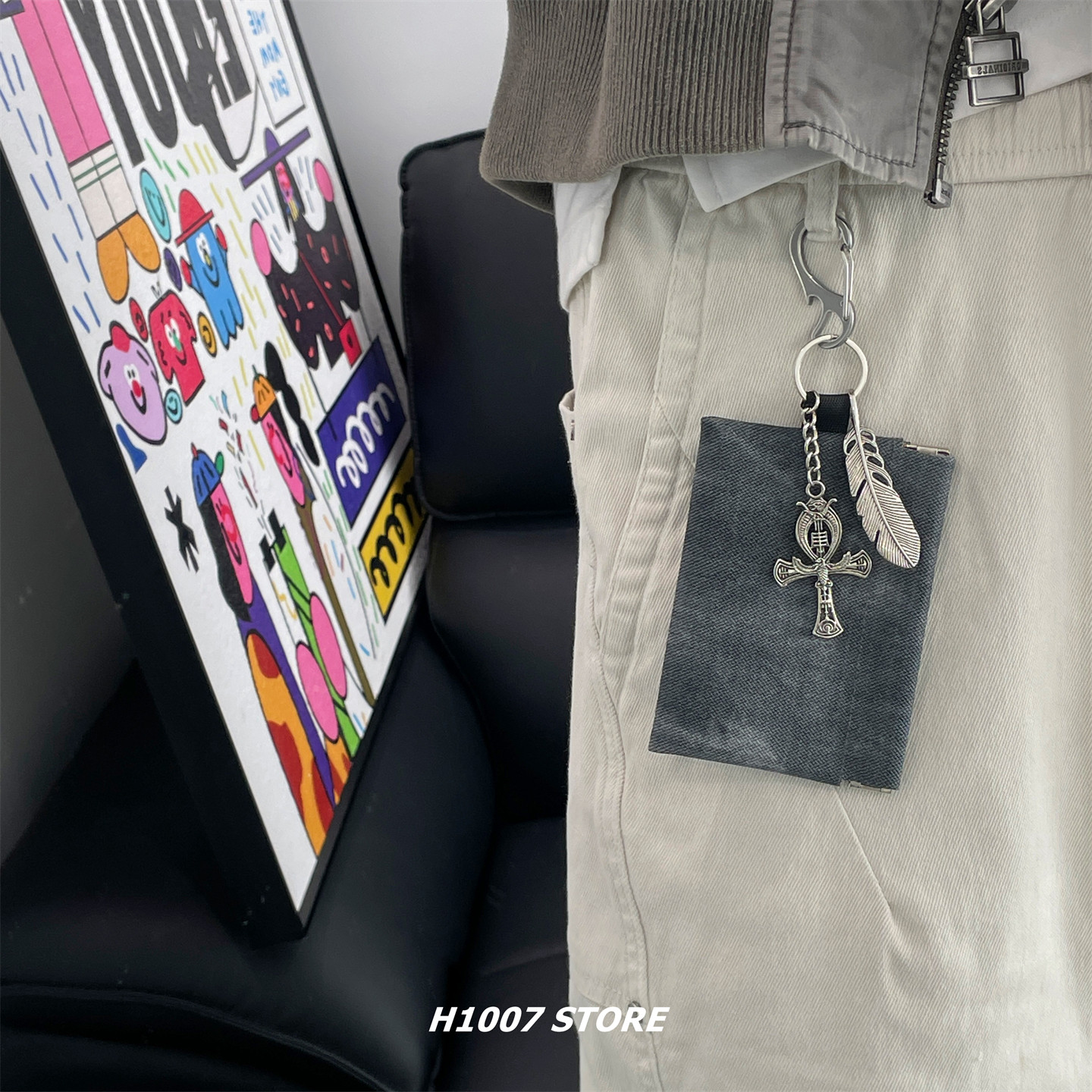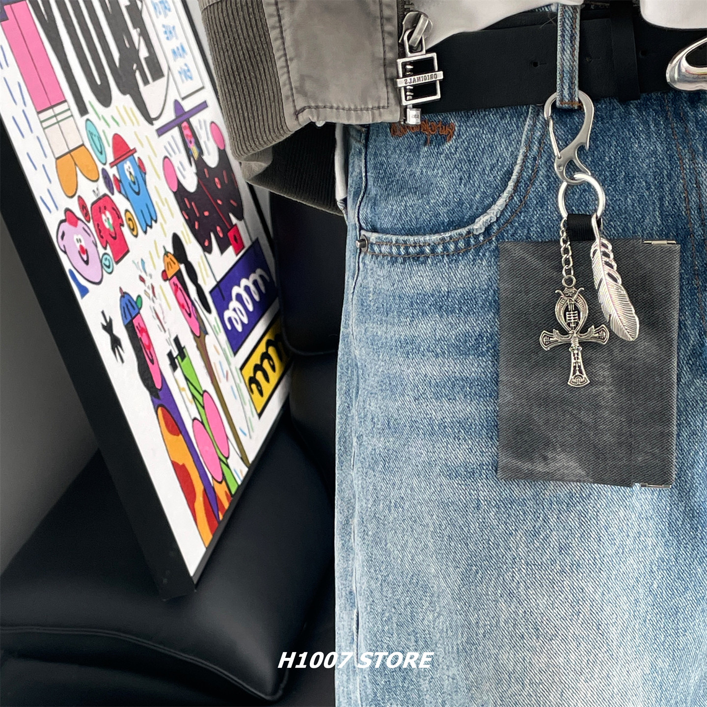 淘黑色链条皮革十字挂件男款裤链女小众设计嘻哈风钥匙包挂腰间挂饰