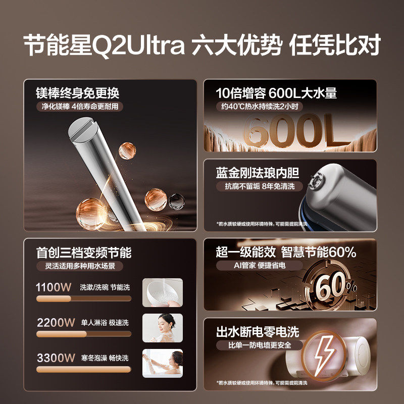 万和Q2Ultra电热水器是一款60升大容量家用储水式热水器,采用先进的双管变频速热技术,加热更高效、节能更省电。搭载“出水断电”安全系统,用水时自动切断电源,杜绝漏电风险,保障家人洗浴安全。支持50L/60L双模式调节,满足不同用水需求。智能恒温控制,水温稳定舒适,告别忽冷忽热。机身小巧美观,安装便捷,适配多种家居环境。内置多重防护机制,包括防干烧、防超压、防高温等,使用更安心。万和Q2Ultra集安全、节能、速热于一体,是现代家庭理想的健康洗浴解决方案。