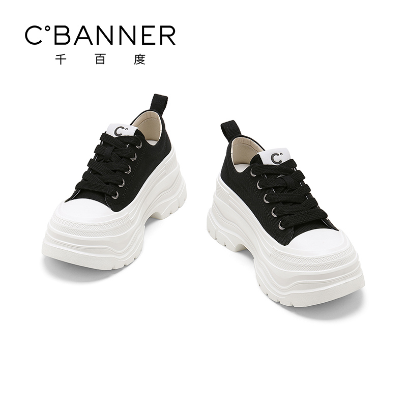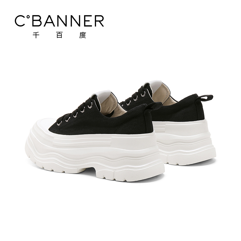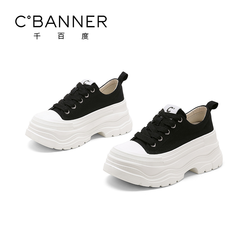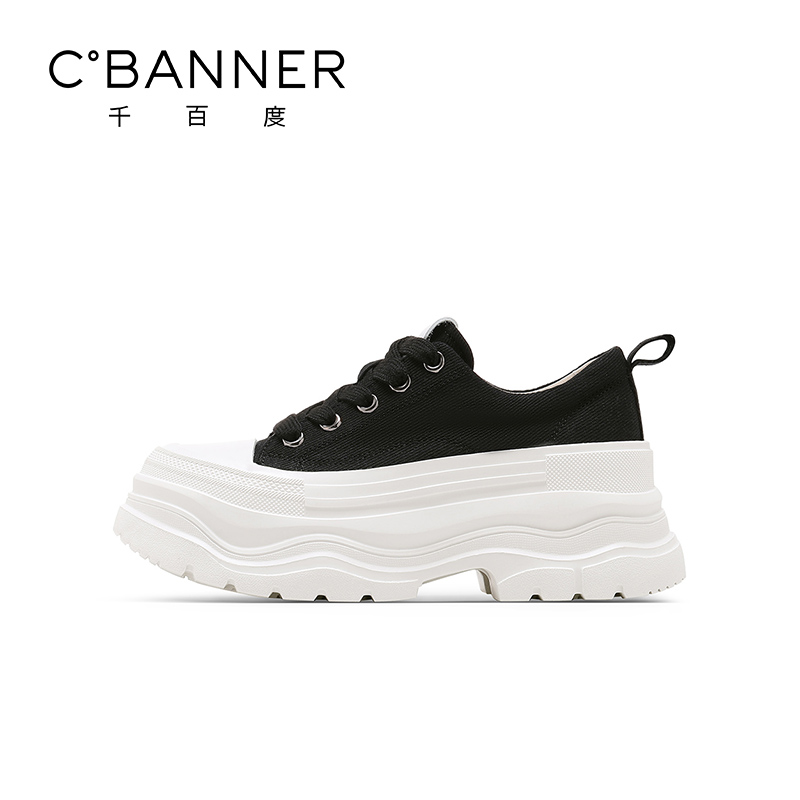天猫千百度休闲鞋女秋季新款百搭厚底单鞋松糕女鞋轻便黑色帆布鞋子女
