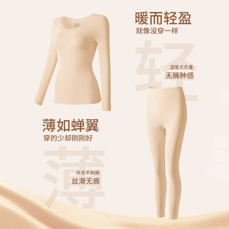 天猫草本初色大码保暖内衣美肤发热秋衣秋裤套装胖mm200斤超薄肌底衣
