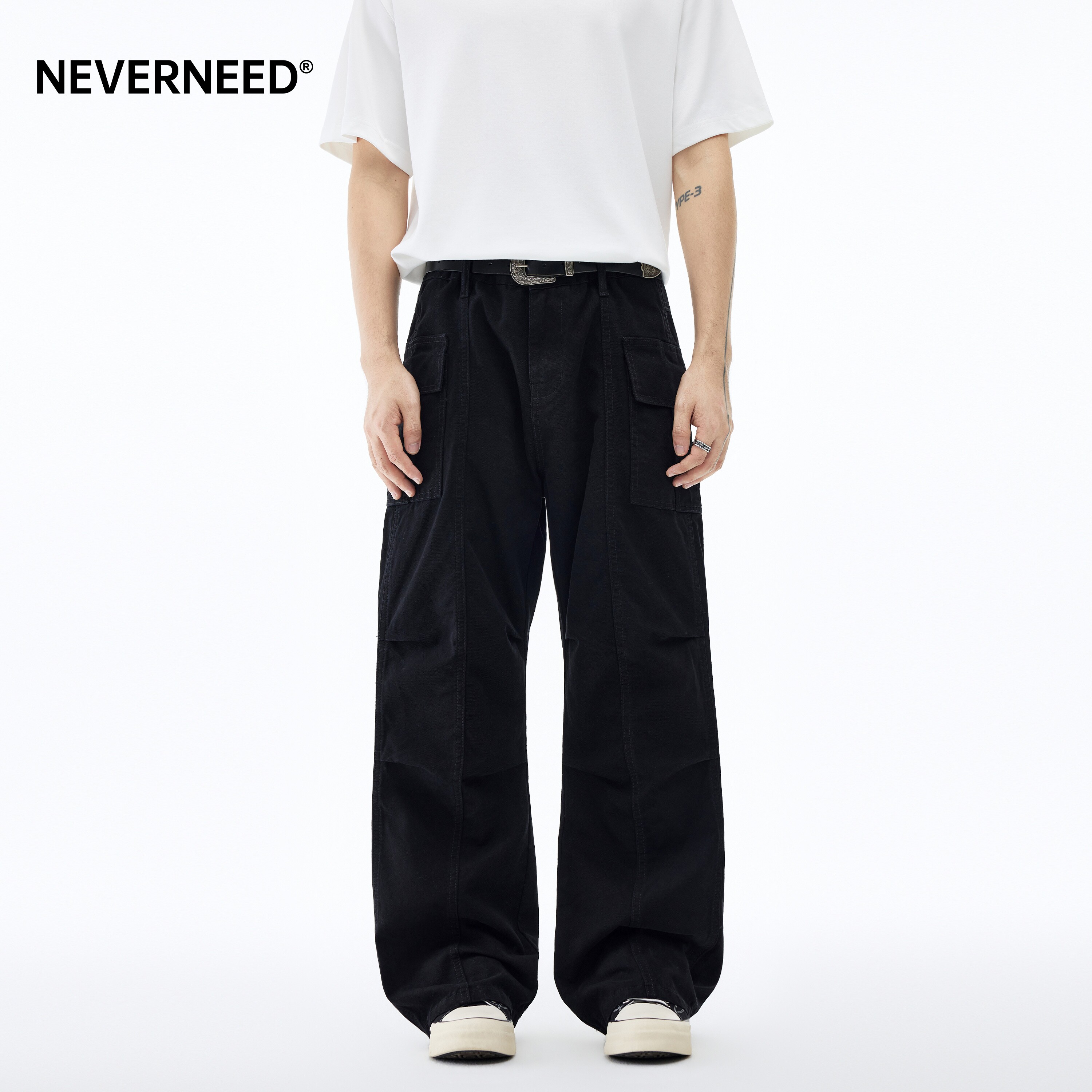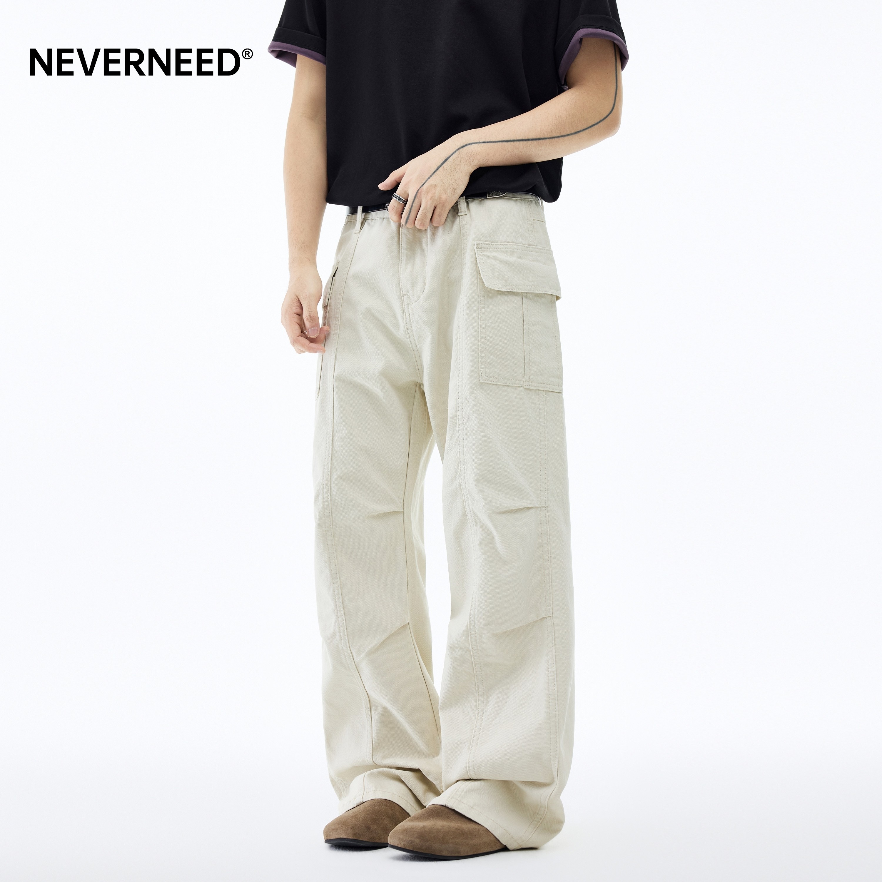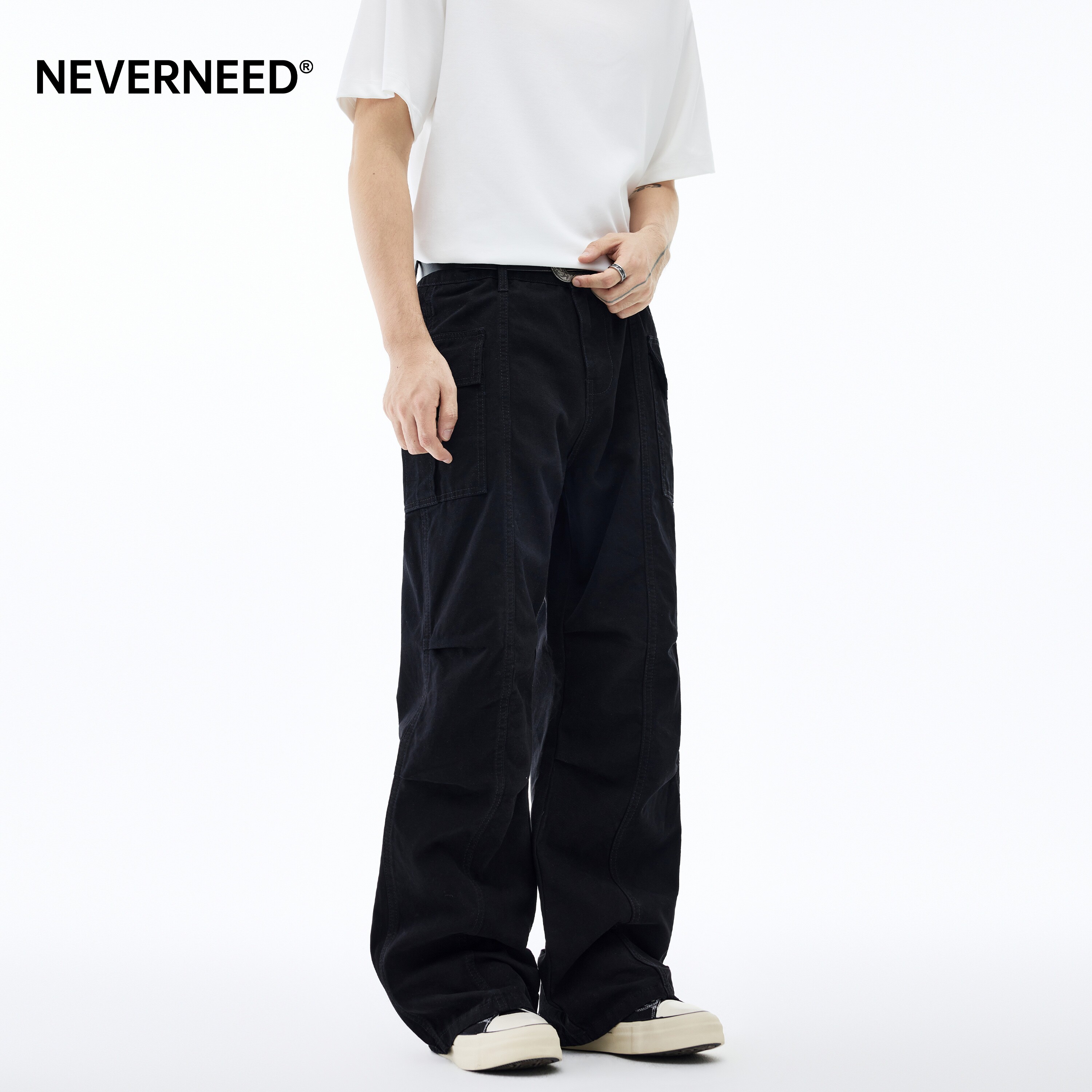 NEVERNEED水洗宽松直筒牛仔裤男春季美式高街vibe做旧磨破阔腿裤