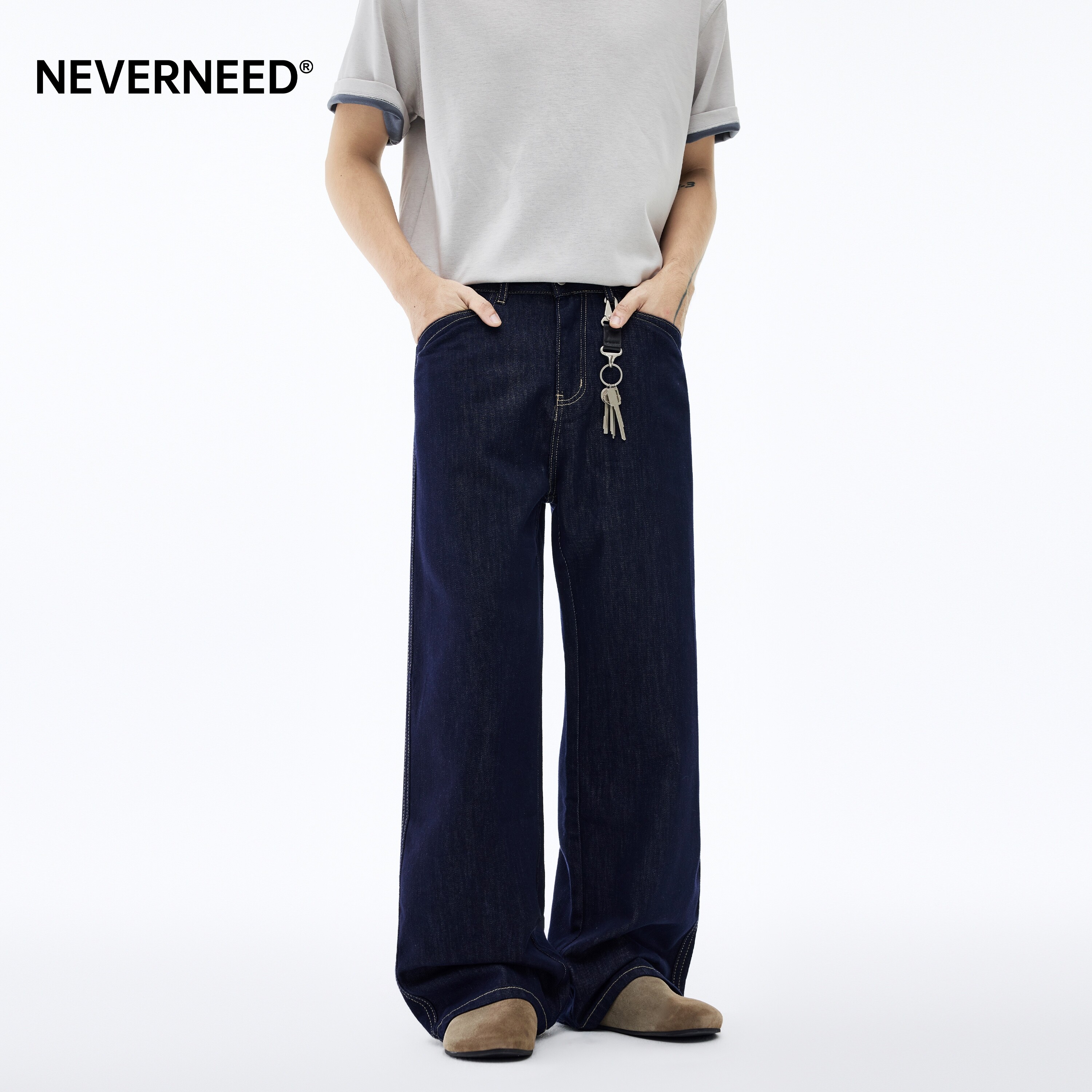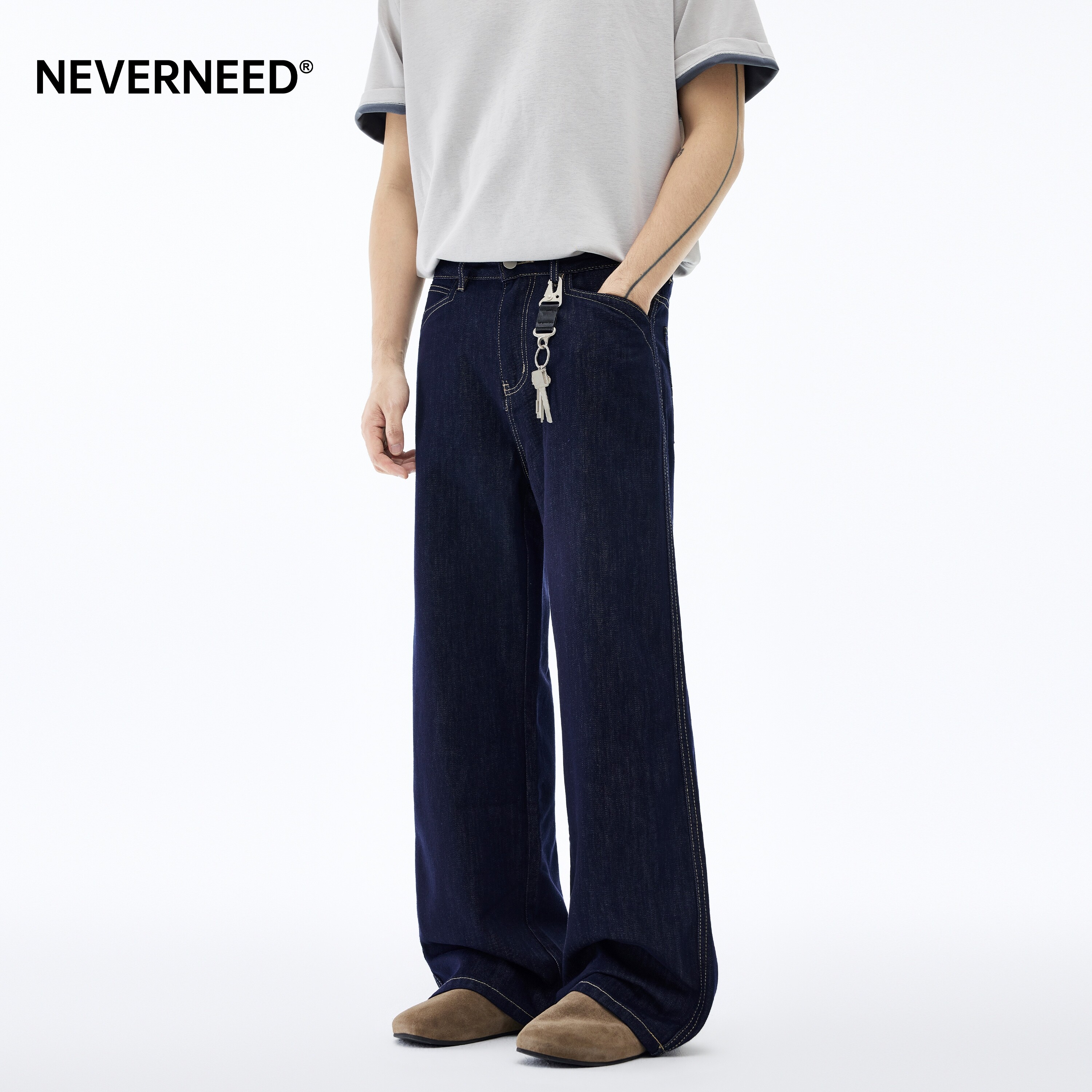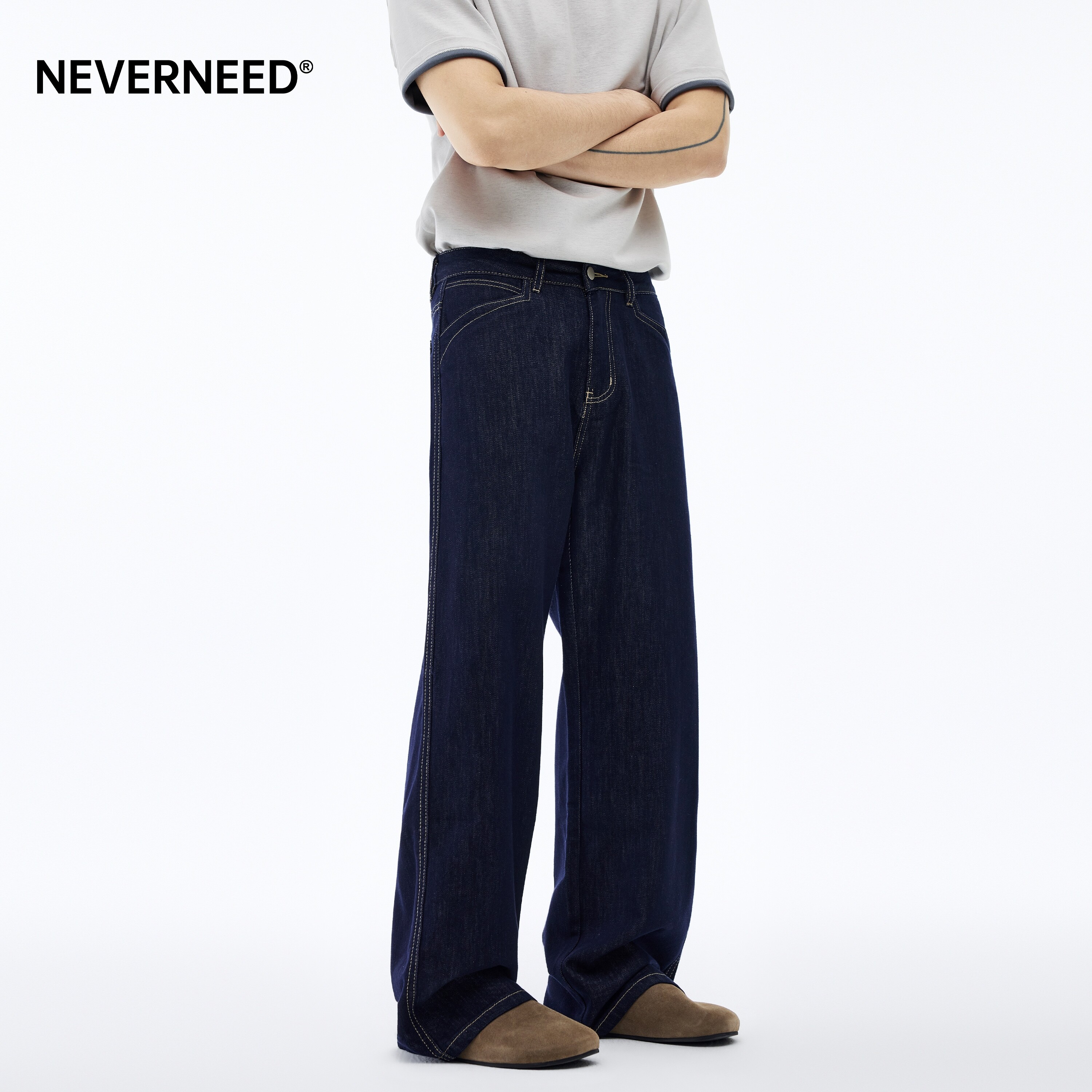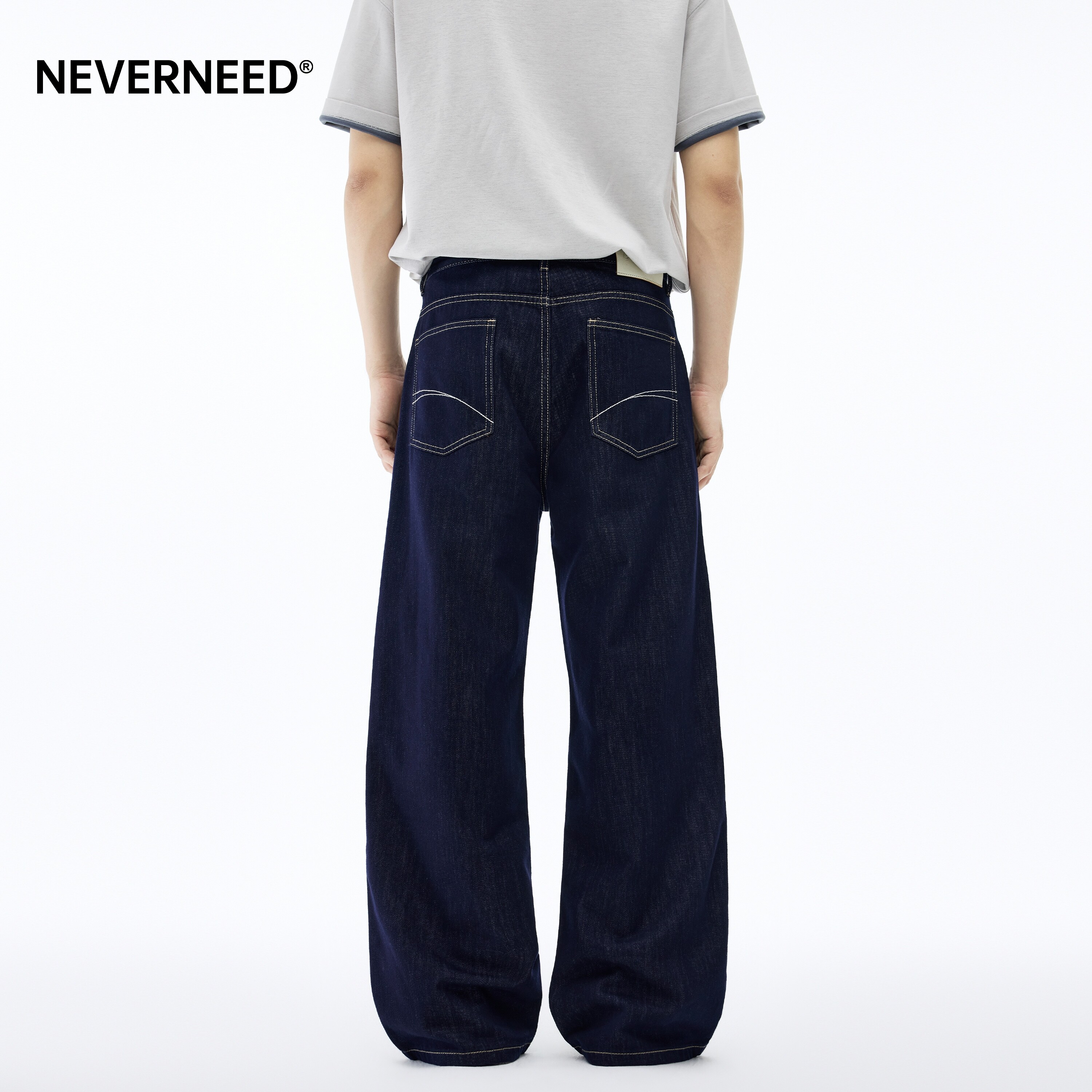 淘宝NEVERNEED莱赛尔原色宽松牛仔裤男春季美式cleanfit明线阔腿A字裤