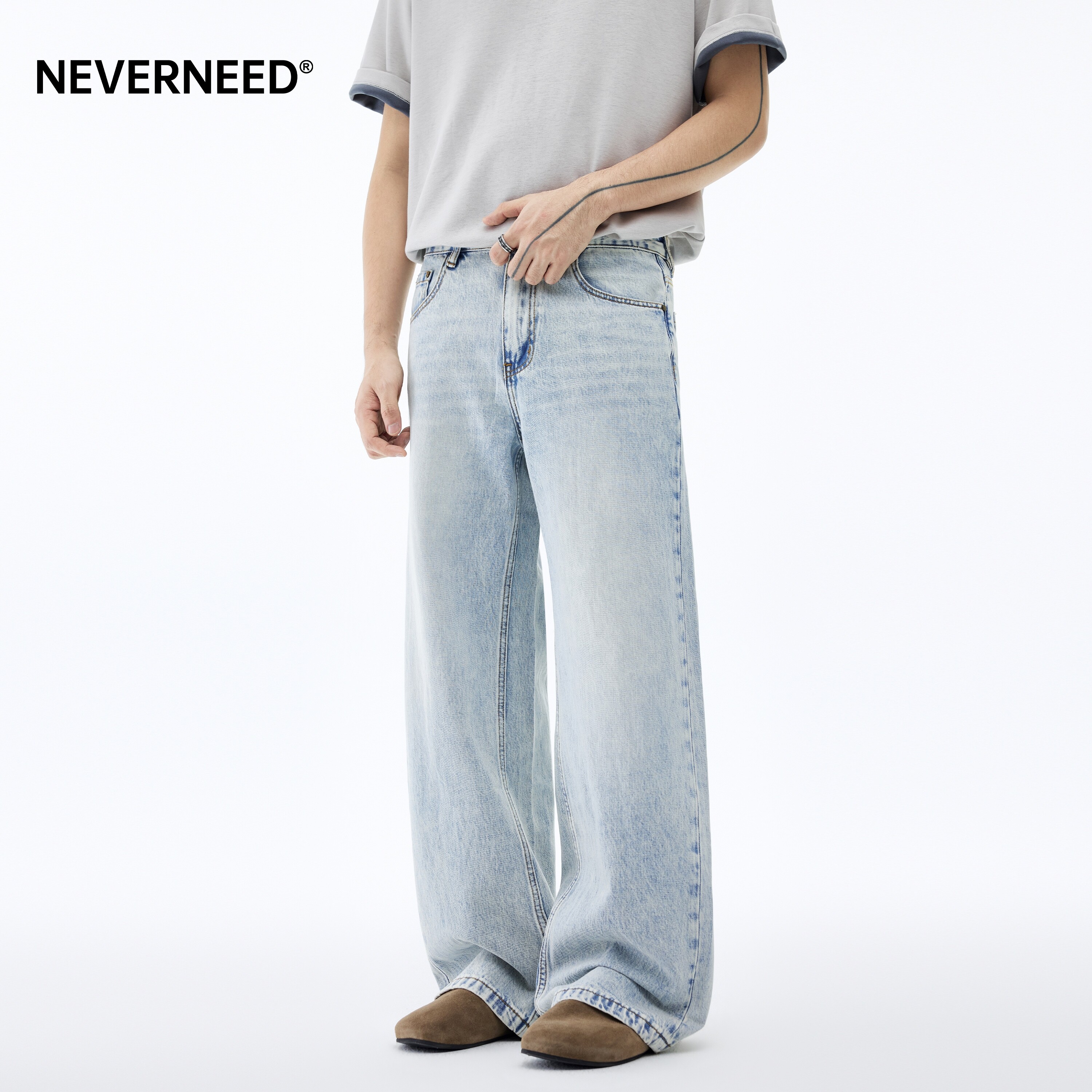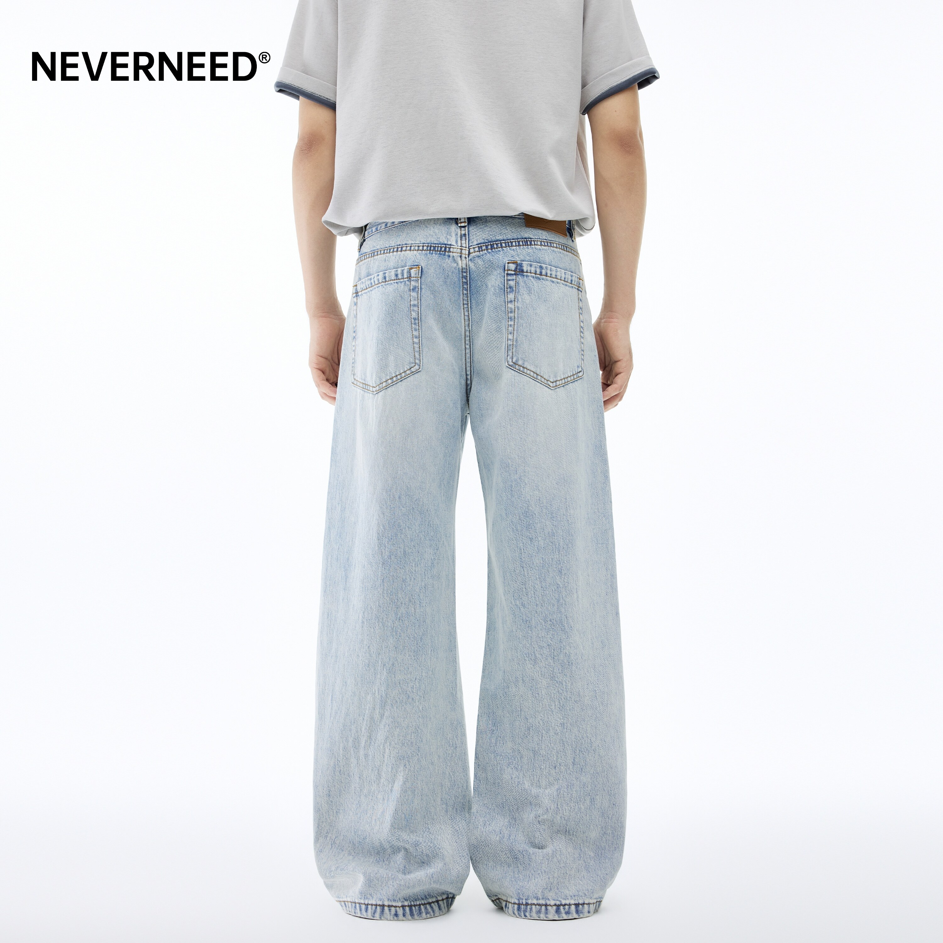 NEVERNEED水洗宽松直筒牛仔裤男春季美式高街vibe做旧磨破阔腿裤