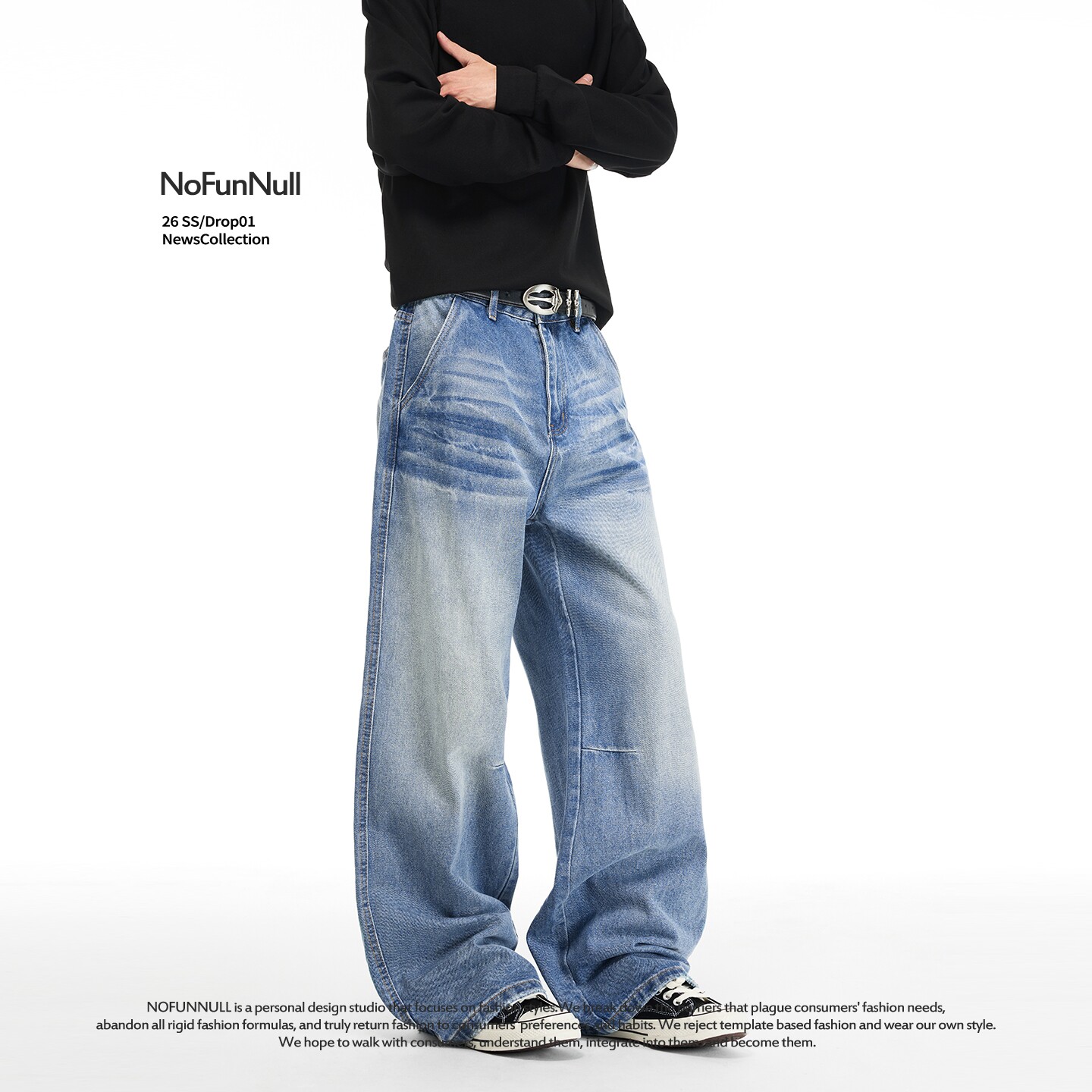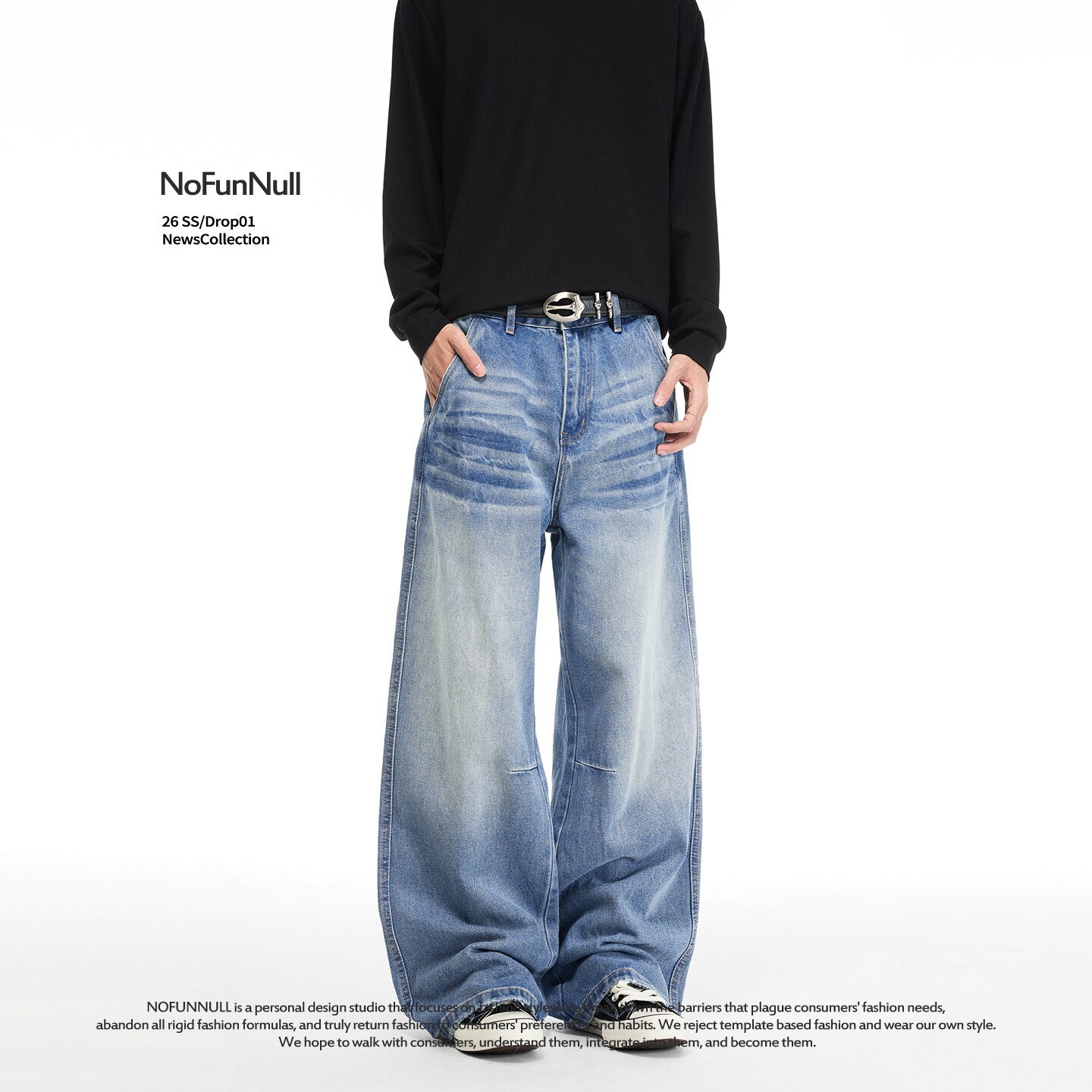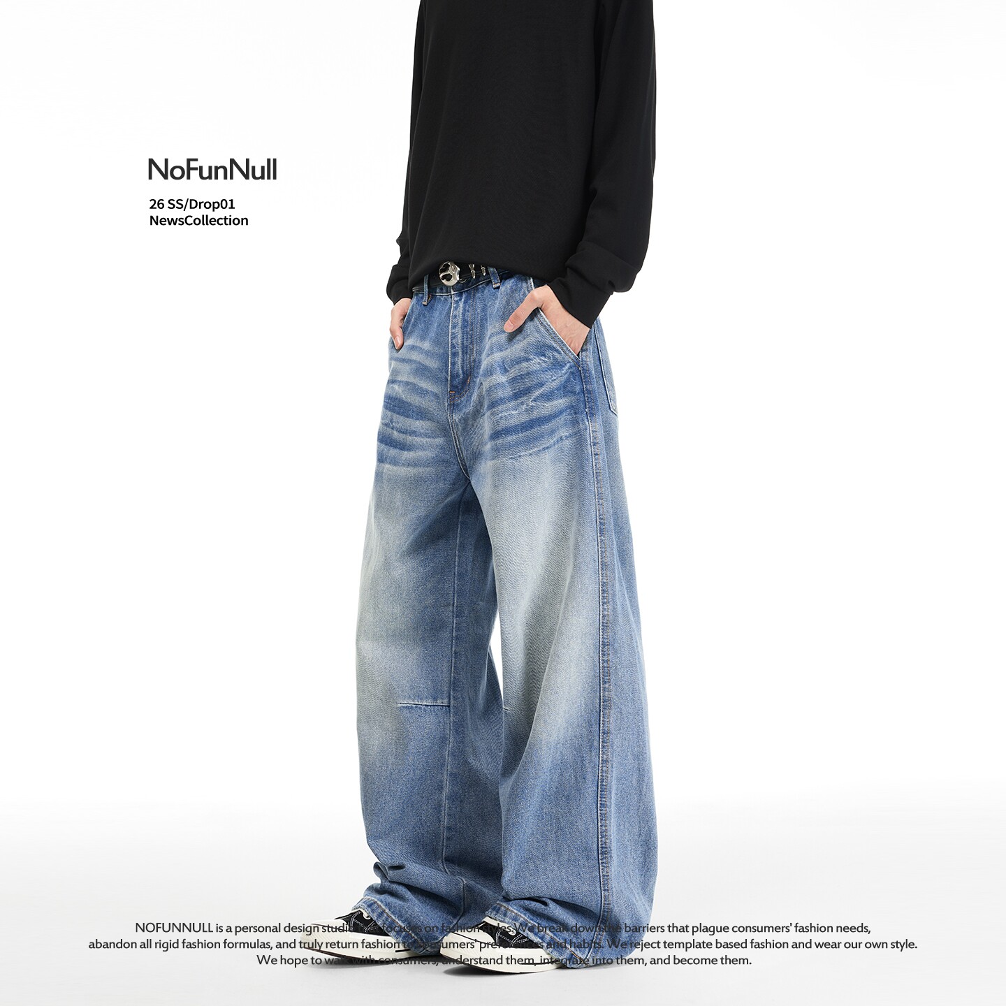 淘宝NOFUNNULL 美式复古蓝水洗猫须牛仔裤男女垂坠感拖地阔腿直筒长裤