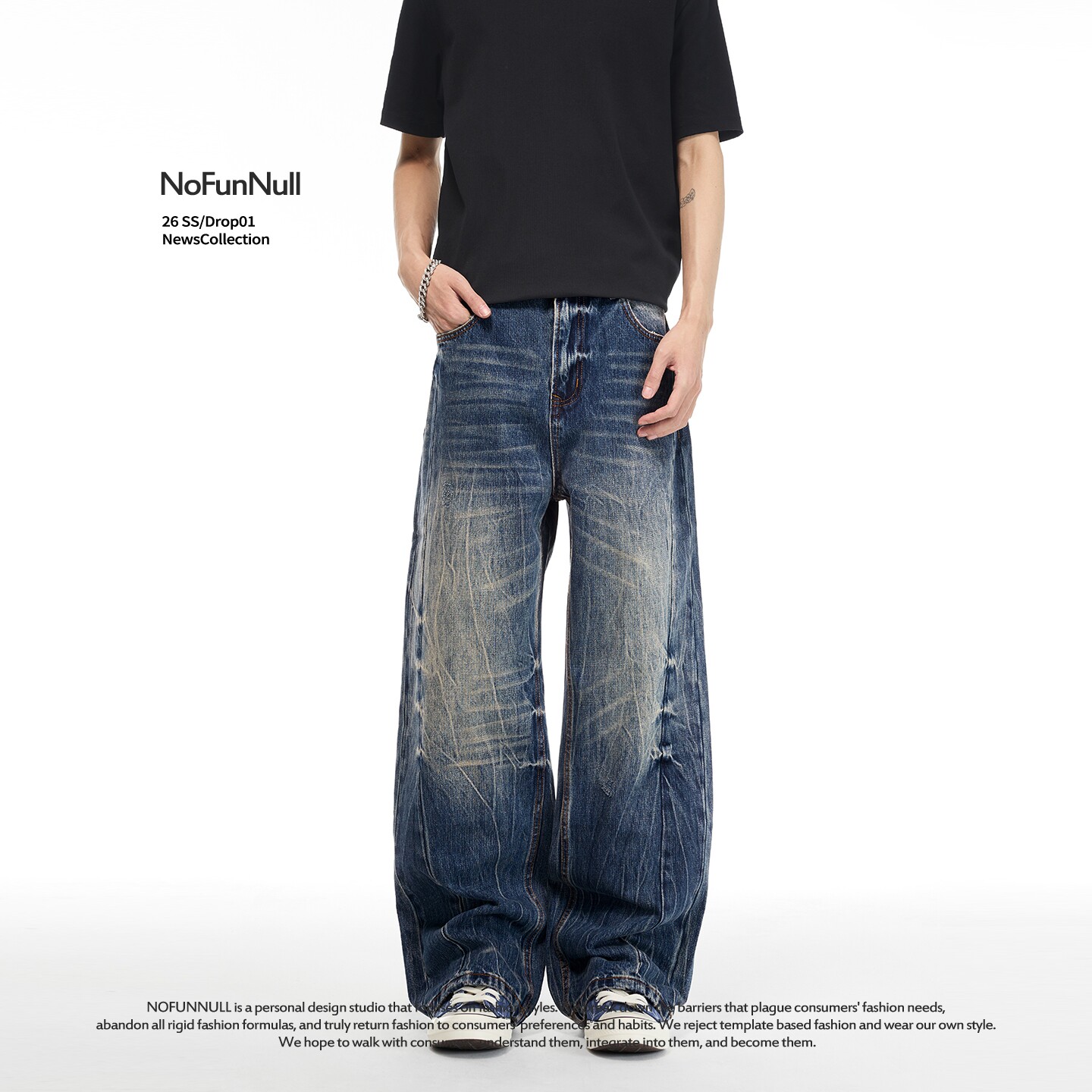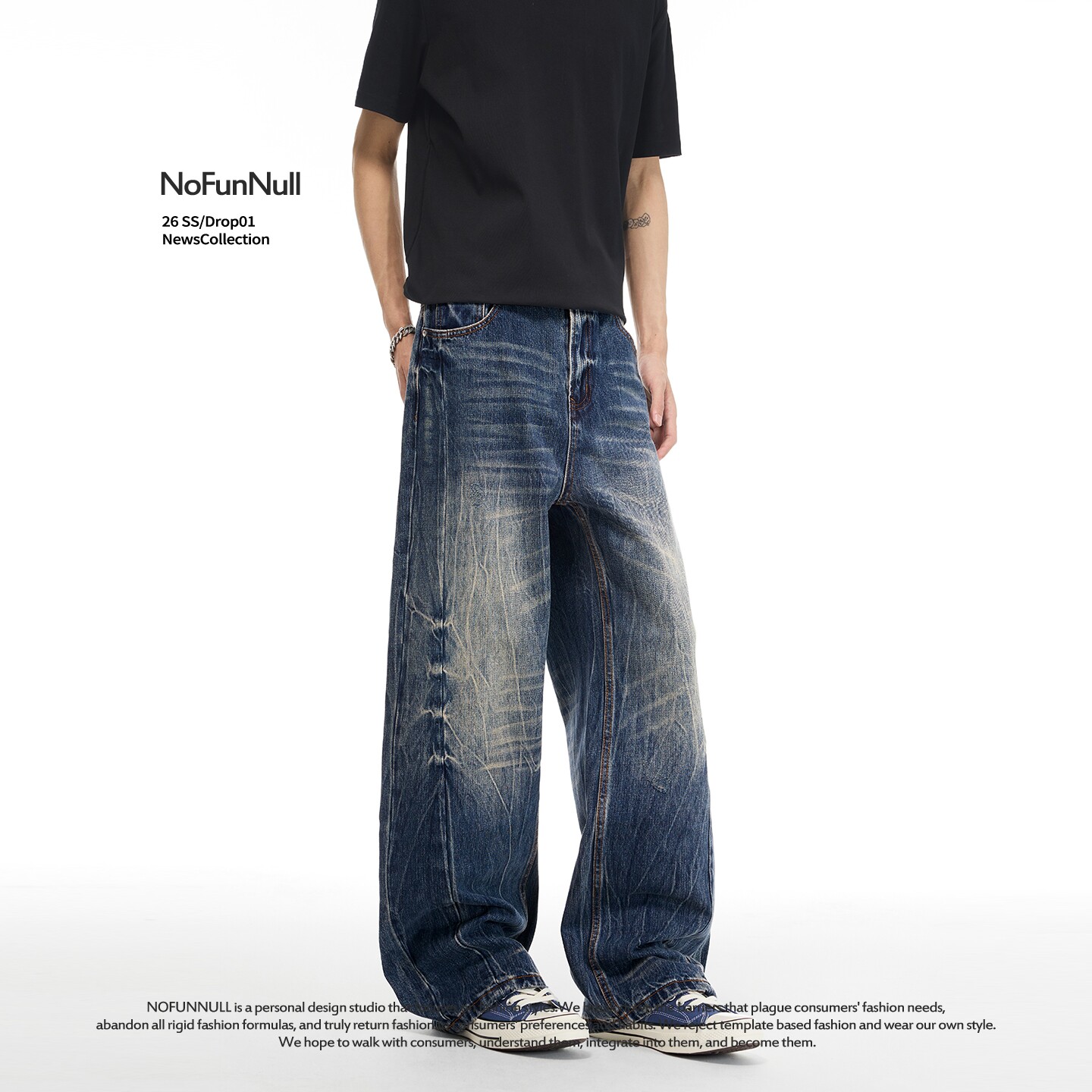 淘MRA男装美式复古重磅原牛色直筒牛仔裤阔腿宽松垂感深蓝牛男春秋