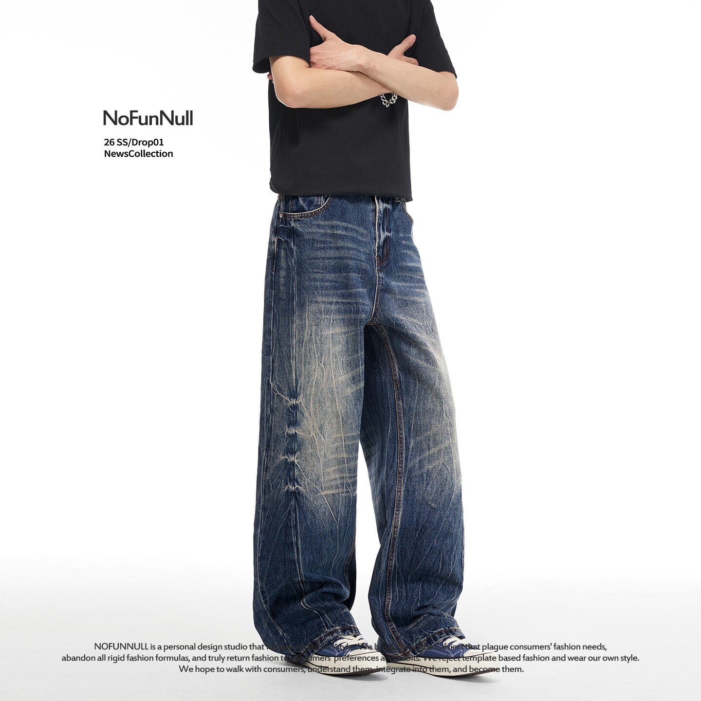 淘宝NOFUNNULL 美式深蓝闪电裂纹牛仔裤男女重水洗复古宽松直筒长裤潮