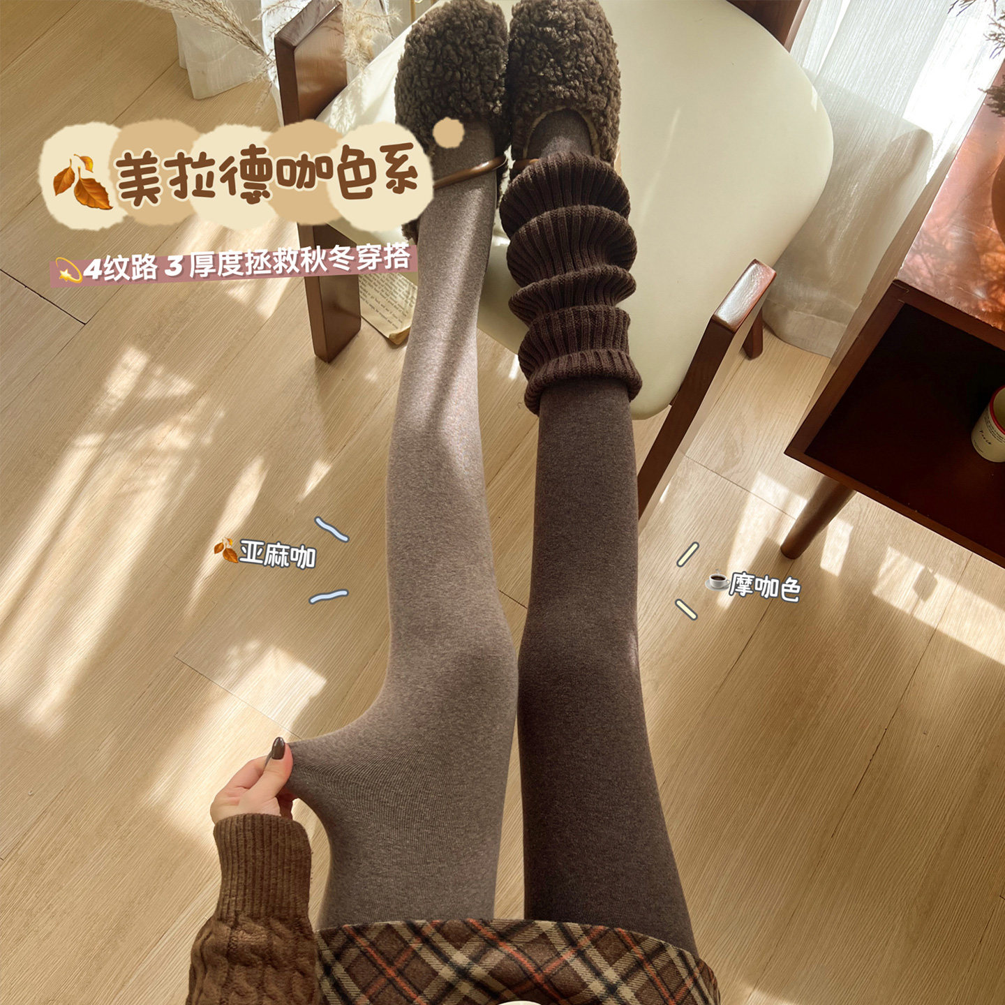 淡时光加绒加厚咖啡色连裤袜,专为秋冬设计,融合美拉德风高级棕色调,温暖又时尚。采用细腻加绒内里,亲肤保暖,有效抵御寒风,适合低温季节日常穿搭。高弹面料贴合腿部曲线,显瘦不紧绷,轻松塑造修长美腿。咖啡棕色低调优雅,百搭各类裙装、大衣与短靴,提升整体造型质感。加厚设计兼顾舒适度与保暖性,久穿不易变形、起球。无论是通勤、约会还是休闲出行,这款连裤袜都能为你带来温暖与自信,是秋冬衣橱的必备单品,演绎温柔而高级的冬日风情。