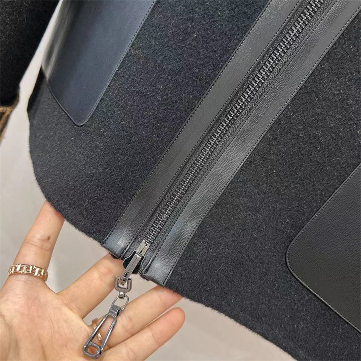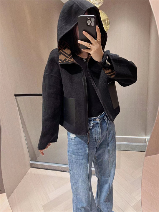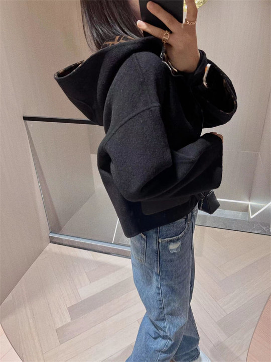 淘宝新款真皮口袋拉链连帽双面羊绒羊毛混纺宽松短款夹克外套大衣女