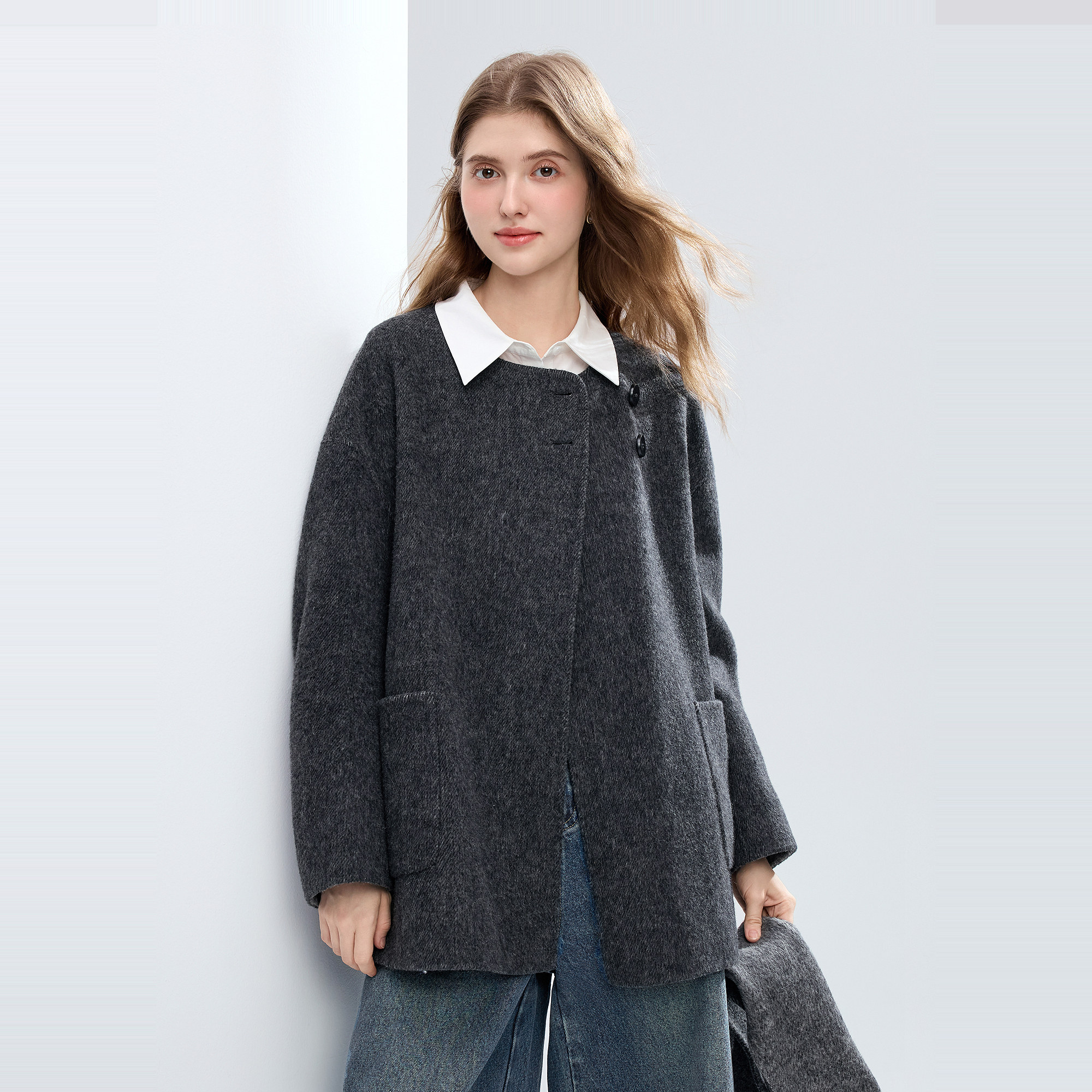 betu百图2025年冬季新款高级感羊毛双面呢子大衣,精选优质羊毛面料,双面织造工艺细腻挺括,保暖性与垂感兼具。简约圆领设计优雅大方,线条流畅,凸显女性知性气质。利落剪裁搭配微廓形版型,包容身形又不失精致轮廓,轻松打造高级冬日穿搭。门襟隐形扣饰细节考究,侧边斜插口袋兼顾实用与美观。多色可选,适配通勤、约会等多种场合,是冬日衣橱不可或缺的质感单品。百图以匠心工艺诠释现代女性优雅与力量,让温暖与风度并存。
