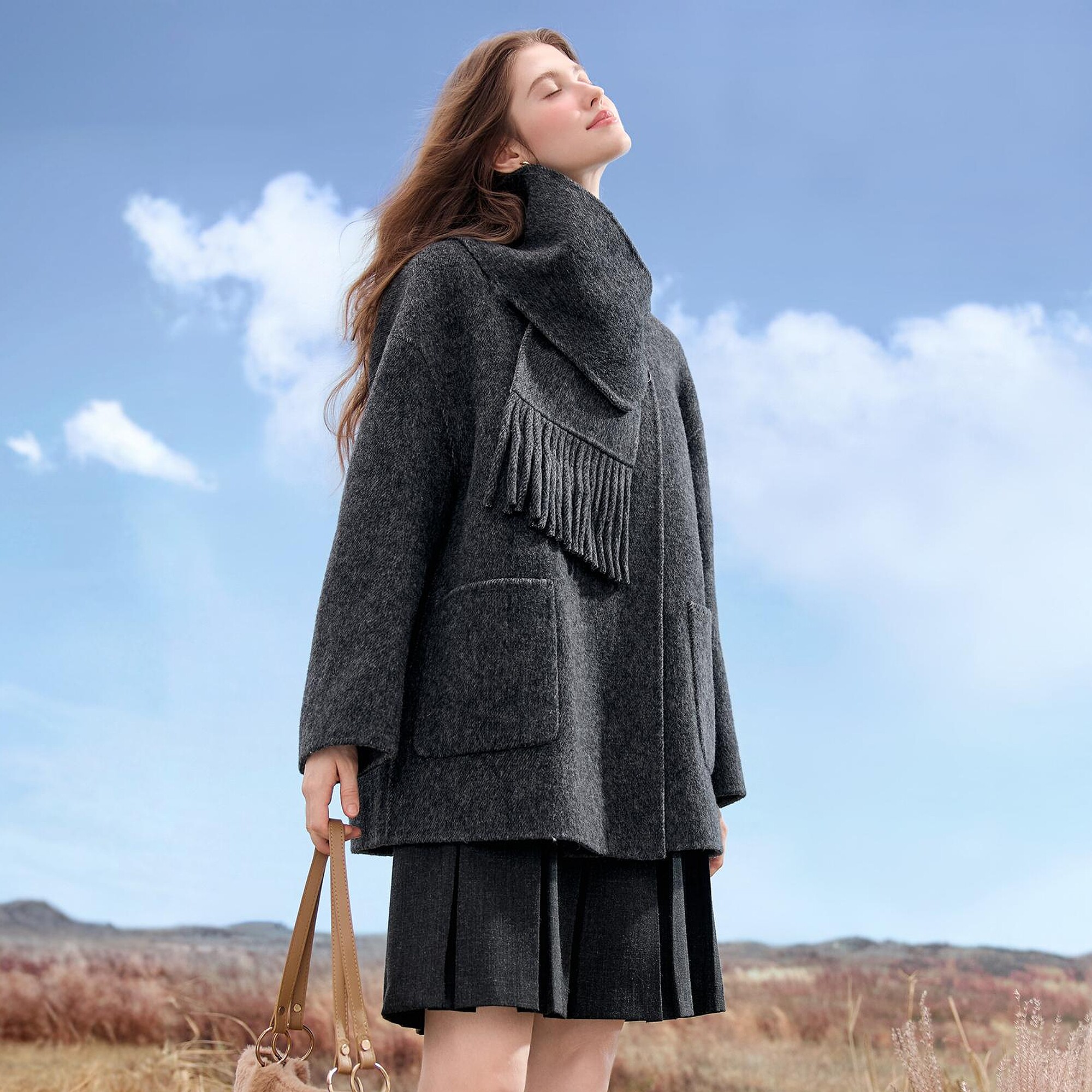 淘因由 奢牌秀场气质wang炸及简轻量无压感时髦多穿围巾领毛呢大衣