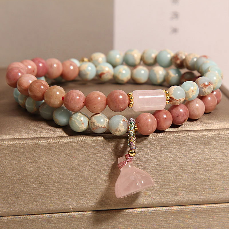 这款新中式寿山石双圈手链,融合传统东方美学与现代轻奢设计,以天然红纹石与温润寿山石为主材,巧妙点缀莲蓬造型吊坠,寓意吉祥圆满。双圈结构贴合手腕,层次丰富却不显繁复,展现小众精致的审美格调。红纹石色泽浓郁如霞,寿山石质地细腻凝润,搭配哑光金属配件,整体呈现出低调而高级的质感。无论是日常搭配还是重要场合,都能为女性增添一份优雅与禅意,是兼具文化底蕴与时尚气息的匠心之作,彰显独特品味与东方韵味。