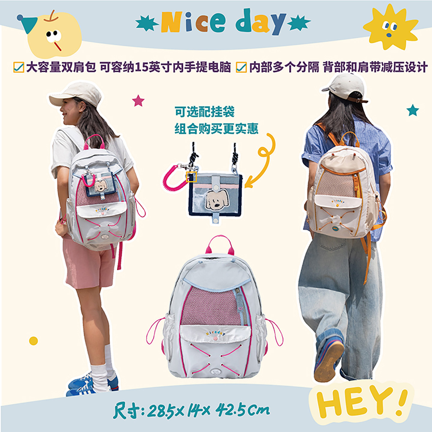 若素良品可爱大容量户外双肩登山包,集实用与颜值于一身,是学生、通勤族及户外爱好者的理想选择。采用轻量耐磨面料,背负舒适透气,大容量主仓可容纳15.6英寸笔记本电脑,分层设计合理,轻松收纳课本、文具、水杯等物品。加宽减压肩带与背部缓冲设计,长时间背负也不累。外观简约百搭,萌趣细节点缀,展现青春活力。无论是上学、上班、短途徒步还是日常出行,都能轻松驾驭,一包多用,实用又时尚,是追求品质与舒适生活的你不可错过的贴心伙伴。
