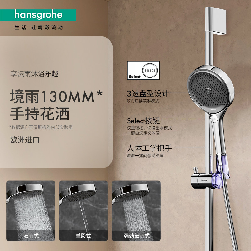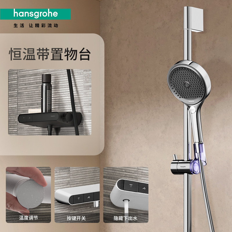 【新品上市】汉斯格雅境雨130手持小欧淋控恒温大置物台淋浴花洒套装,融合德系精工与现代美学。搭载恒温阀芯,精准控温,告别水温骤变;130mm境雨式顶喷,带来细腻雨感沐浴体验;手持花洒支持多档切换,满足不同冲洗需求。创新集成大尺寸置物台,轻松收纳洗浴用品,提升空间利用率。小欧淋控设计操作直观,一键切换顶喷、手持或下出水,便捷高效。整体采用优质材质,防烫防垢,持久耐用。简约欧式风格,适配多种浴室装修,尽享舒适智能沐浴新境界。汉斯格雅,以匠心品质重新定义品质生活。