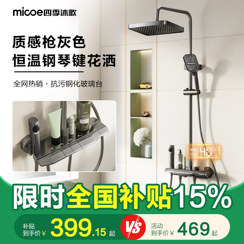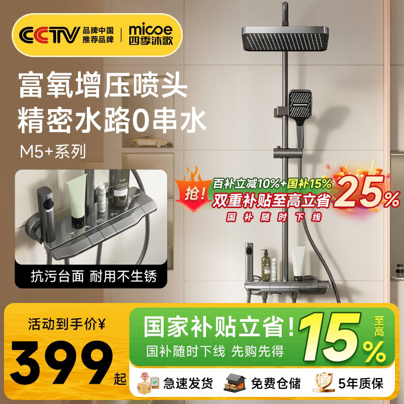 【百亿9折券】四季沐歌卫浴家用浴室恒温增压智能淋浴花洒套装M5,集恒温、增压、智能于一体,打造舒适沐浴新体验。采用高精度恒温阀芯,精准控温,告别忽冷忽热;内置增压技术,出水强劲细腻,低水压环境也能畅享澎湃淋浴。花洒支持多模式切换,满足不同需求,顶喷+手持双配置,覆盖全身。智能触控面板操作便捷,LED水温显示一目了然。精选优质材质,防烫防漏,安全耐用。搭配百亿补贴9折券,性价比超高,是提升居家品质的优选卫浴套装,让每一天的沐浴都成为放松身心的享受。