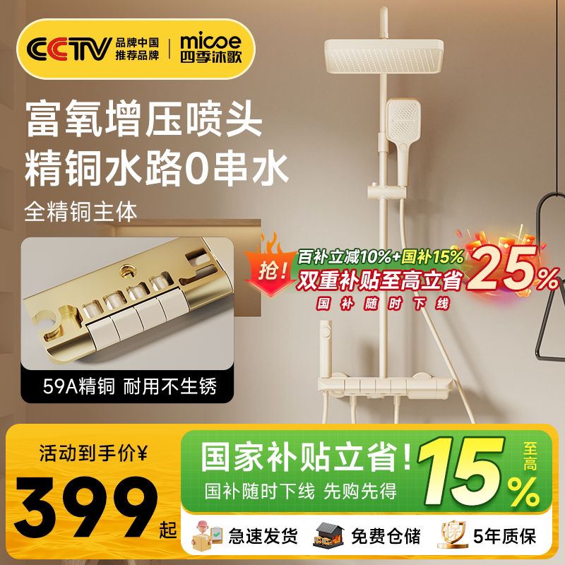 四季沐歌卫浴家用浴室恒温增压智能淋浴花洒套装M3,专为现代家庭打造,集恒温、增压、智能于一体。采用优质精铜主体,耐高温防腐蚀,持久耐用。内置恒温阀芯,精准控温,告别水温骤变,沐浴更安心。创新增压技术,即使低水压环境也能享受强劲雨淋体验。花洒支持多档出水模式,满足不同洗浴需求,顶喷、手持、下出水三重享受。智能触控面板操作便捷,LED水温显示一目了然。搭配【百亿9折券】,性价比超高,轻松升级品质卫浴生活。M3套装安装简便,适配多数家庭浴室,是追求舒适与节能的理想之选。