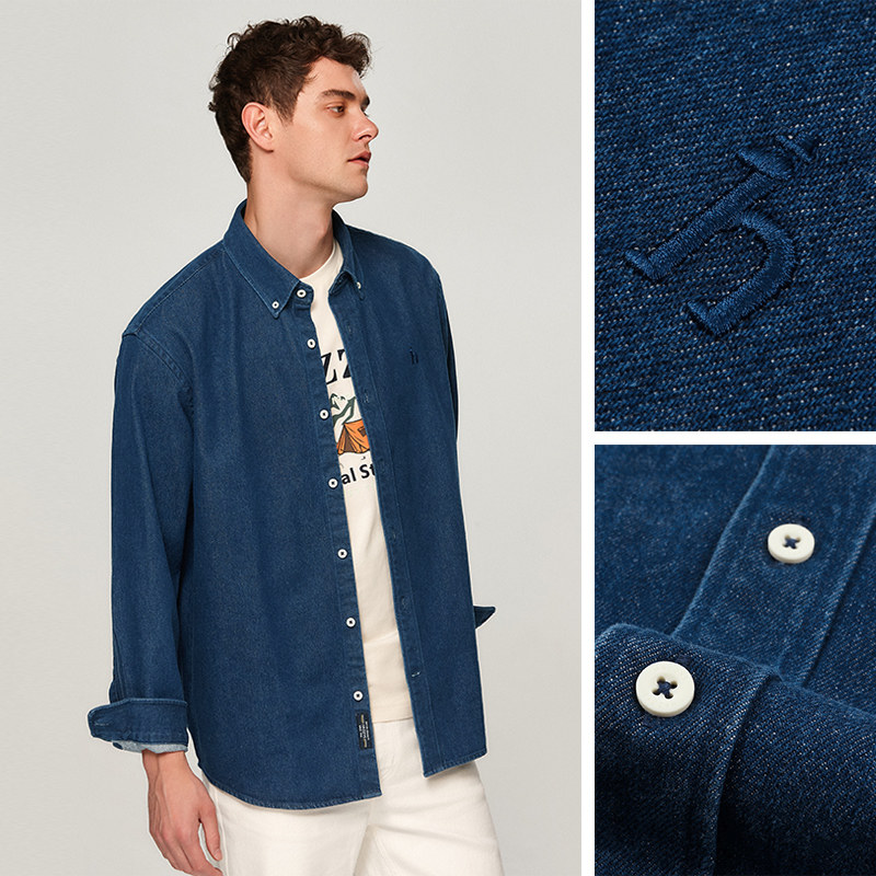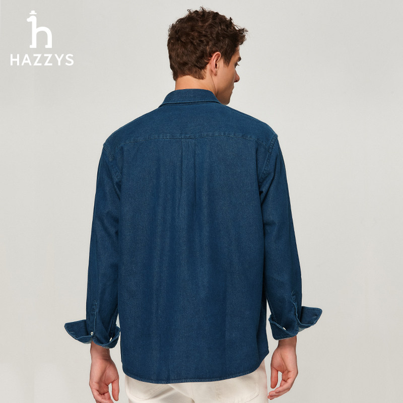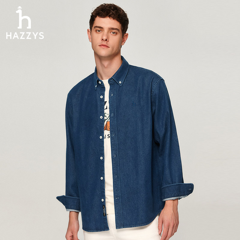 天猫Hazzys哈吉斯男装秋季时尚外套休闲宽松外套牛仔长袖衬衫纯色上衣