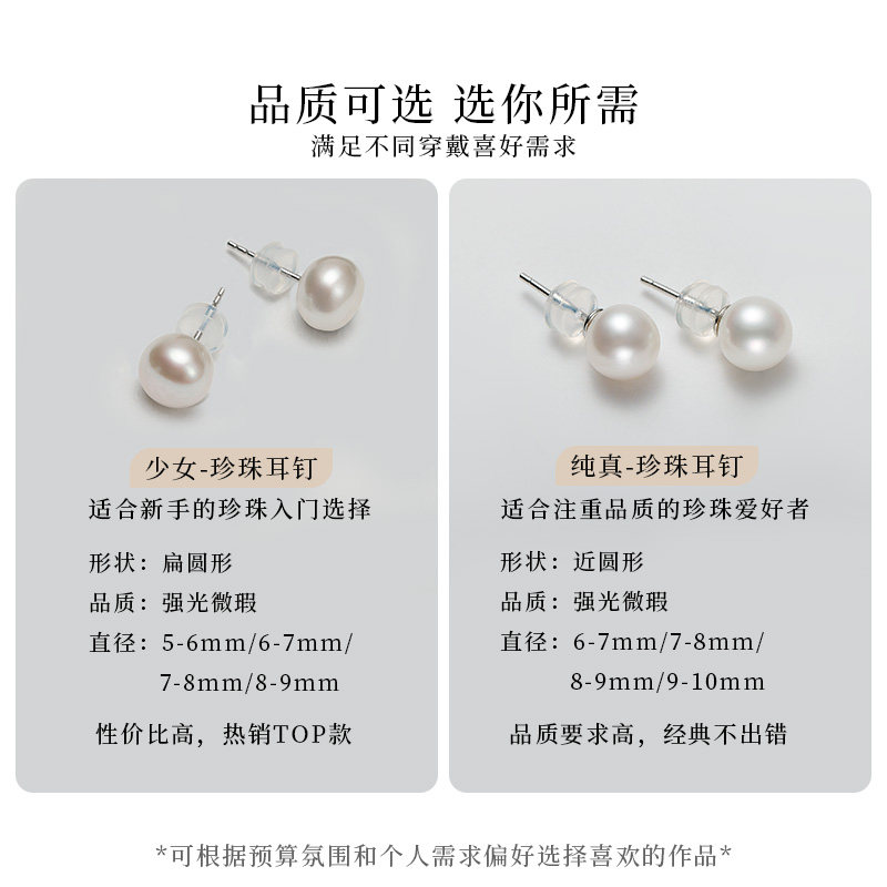 京润珍珠怀华S925银天然淡水珍珠耳钉7-8mm圆形通勤珍珠耳饰女D