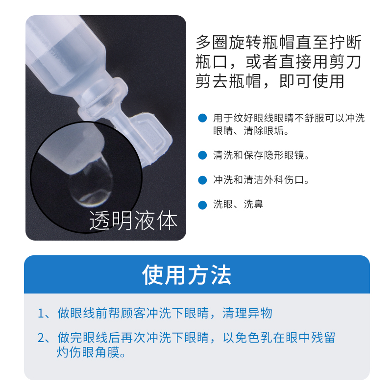 商品介绍:半永久纹绣专用盐水清洁液,专为眉毛、眼部和眼线纹绣护理设计。小支装,方便携带与使用。该产品具有强大的清洁功能,能有效清除纹绣过程中的残留物,确保纹绣区域的洁净,降低感染风险。其盐水成分温和,不刺激肌肤,适用于敏感眼部。是半永久纹绣过程中必不可少的护理工具,让您的纹绣效果更加持久自然,同时保障肌肤健康。