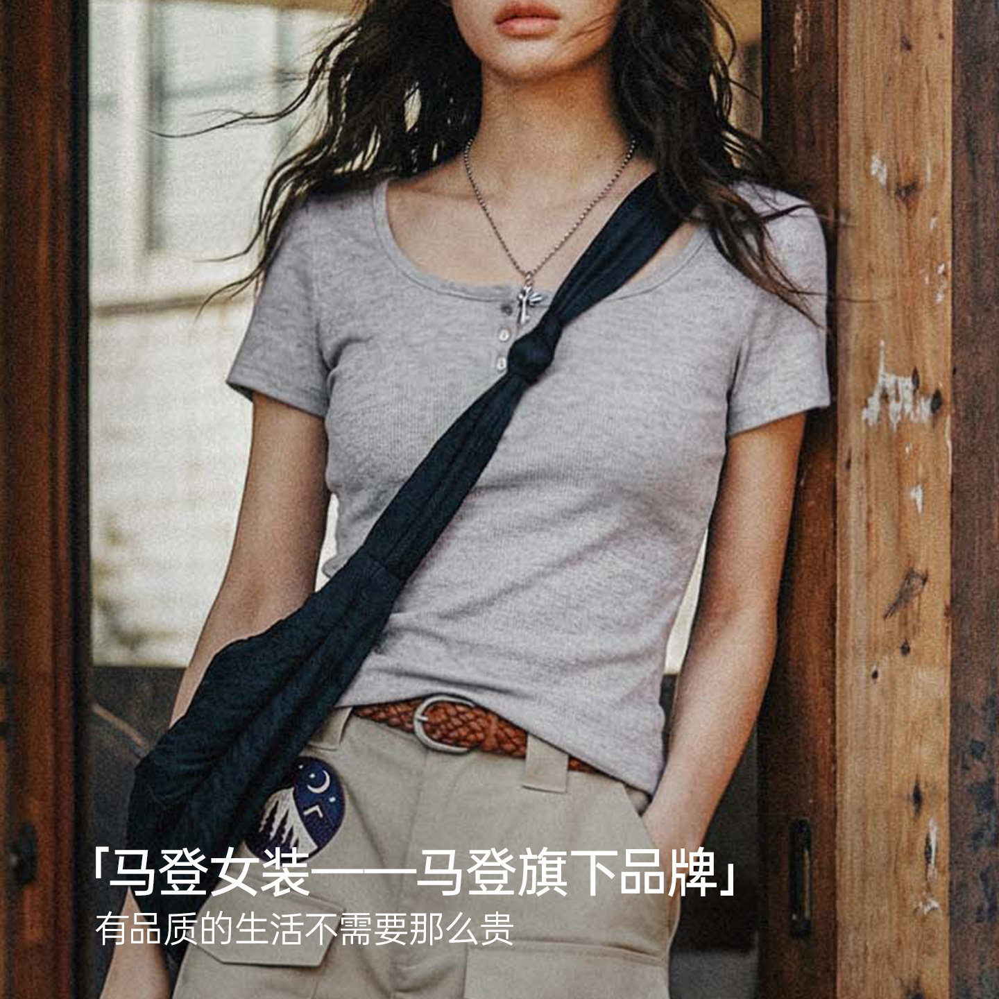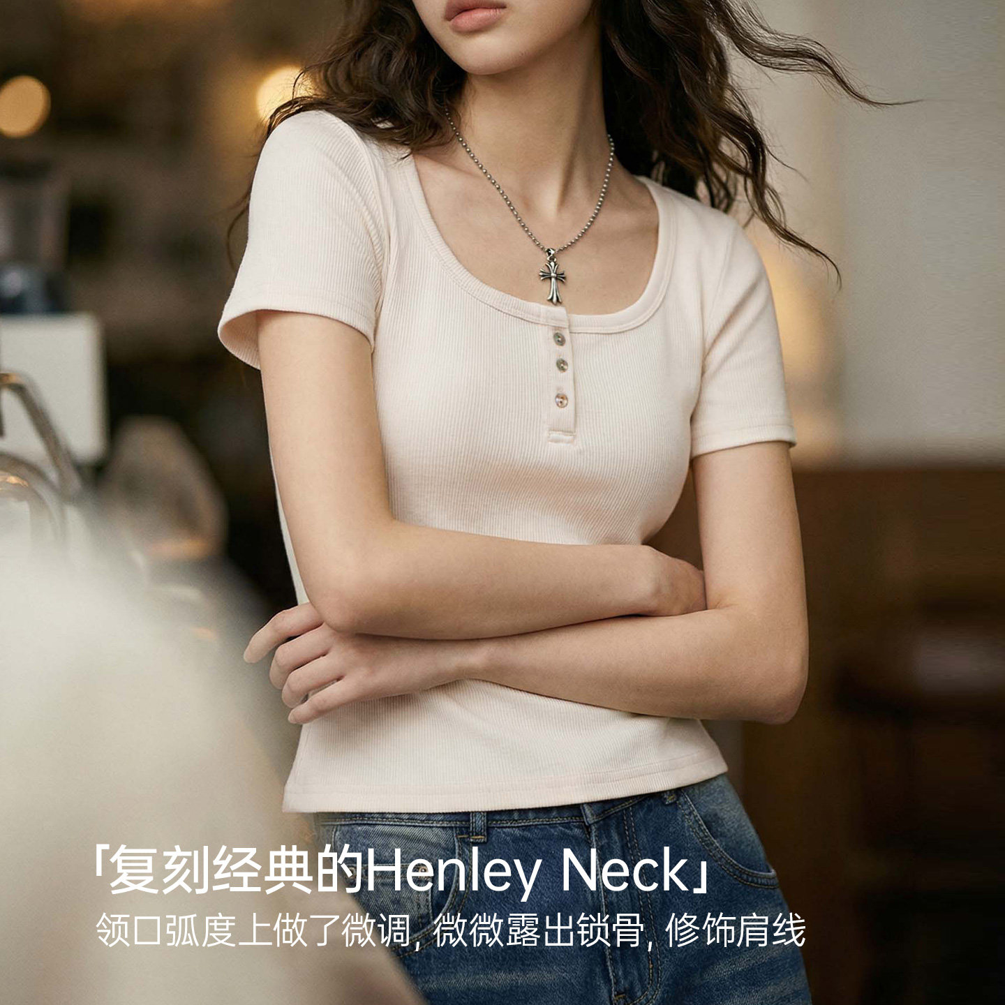 淘宝马登美式复古亨利领大方U领正肩修身短袖T恤内搭打底衫上衣女士夏