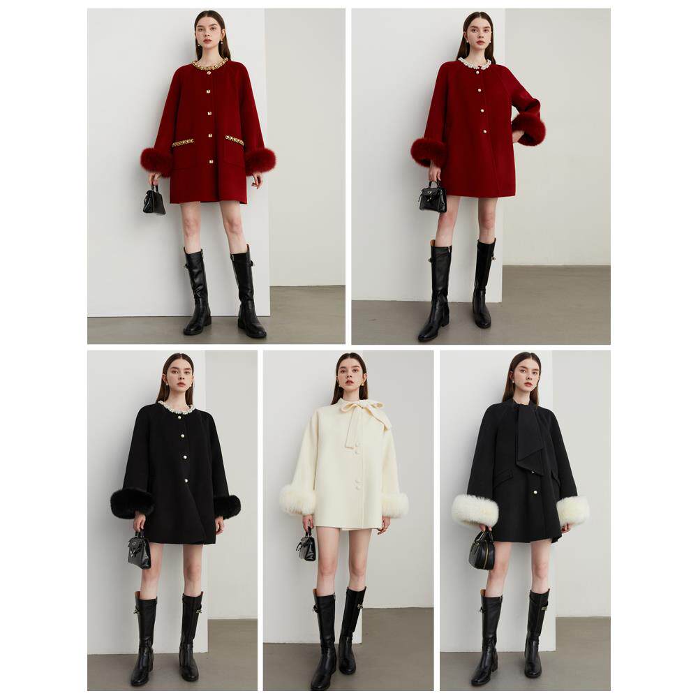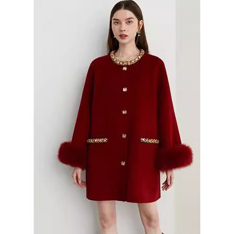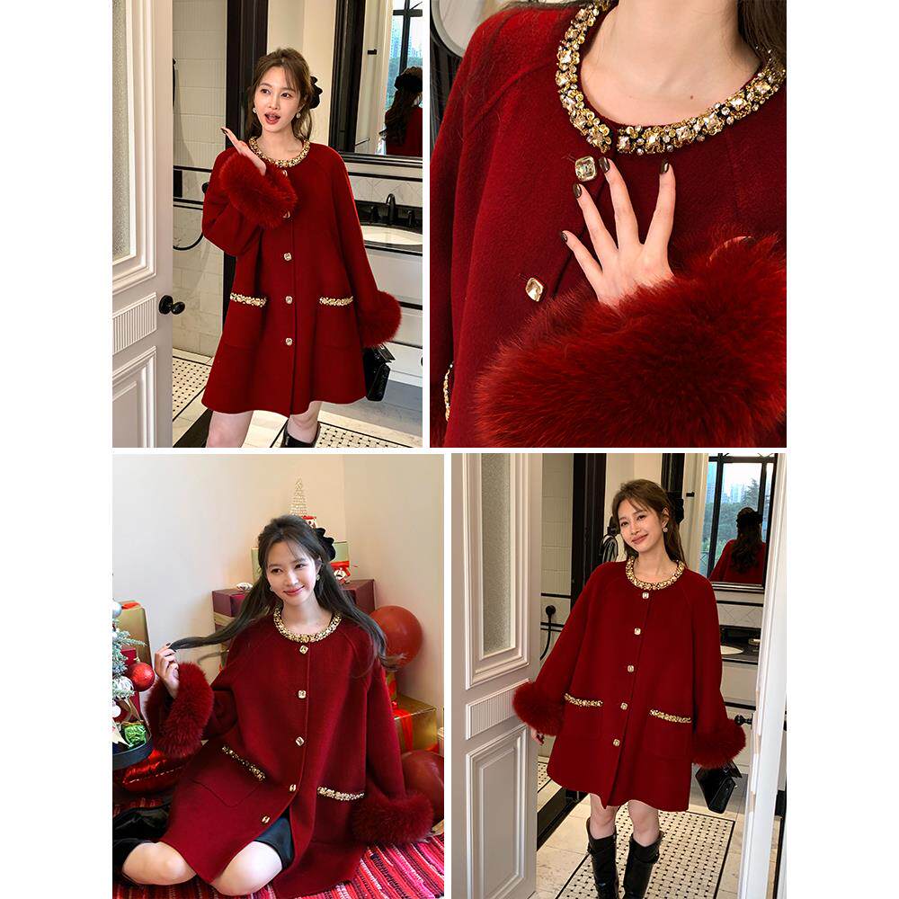 天猫爵莱菲大码2025冬季新款红色大衣宽松女狐狸毛羊毛毛呢外套胖mm