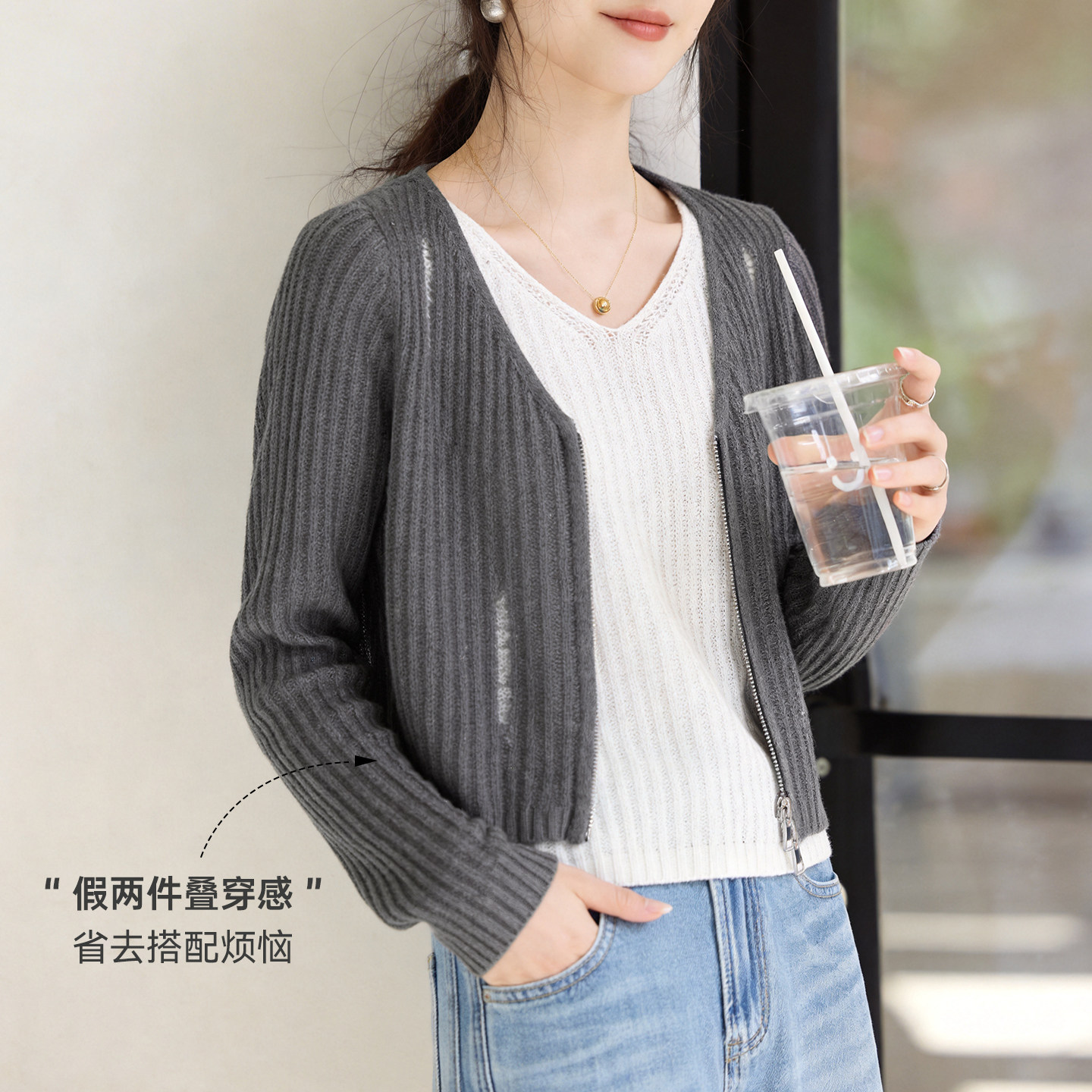 三福打底衫女2026新款春季简约纯色收腰V领修身休闲长袖上衣女装