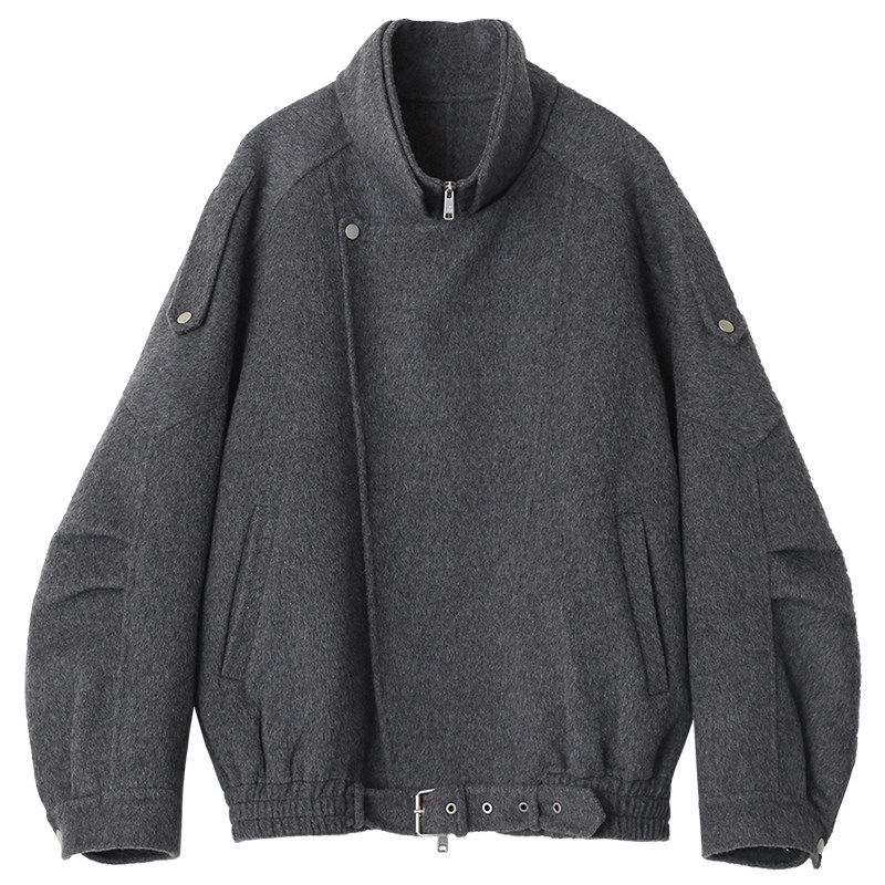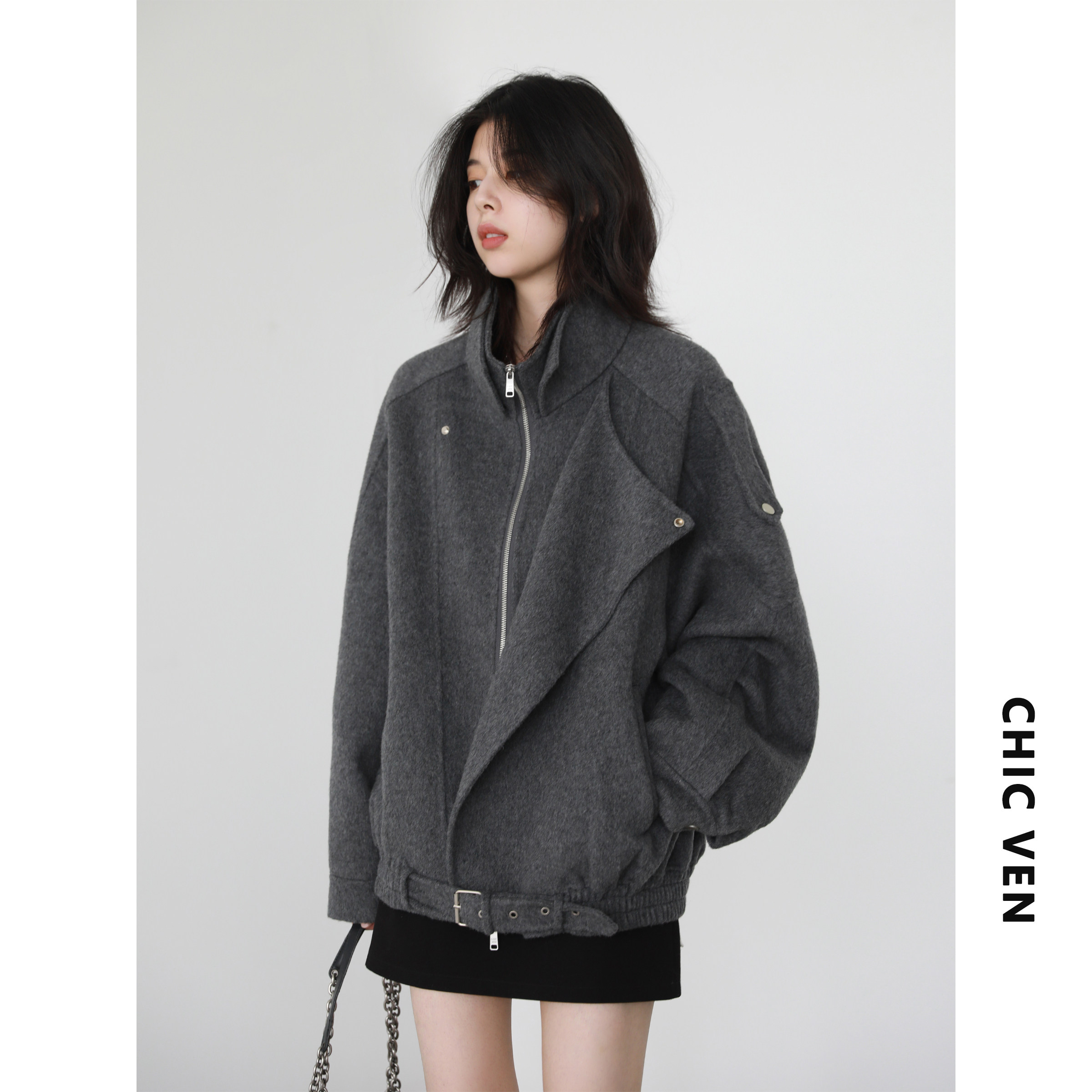 淘宝CV大码女装春新款机车风立翻领毛呢大衣简约防风羊毛呢外套女胖mm