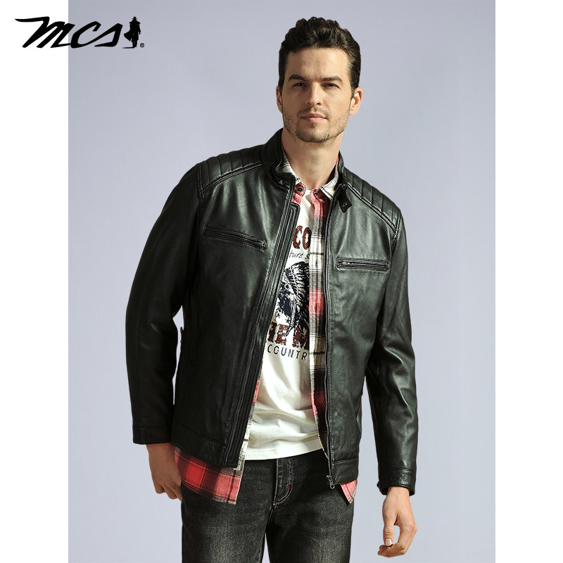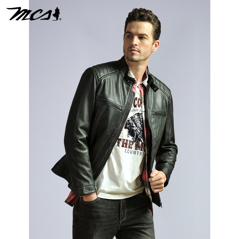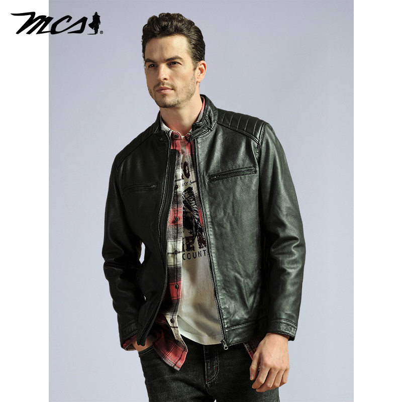 天猫MCS男装源自万宝路秋季山羊真皮男立领机车皮衣修身外套男春秋款