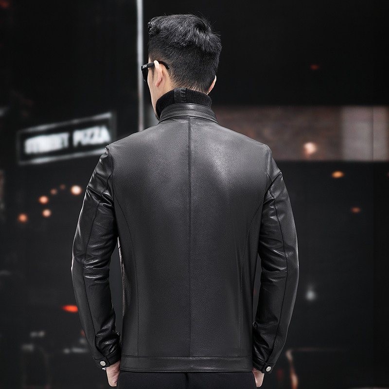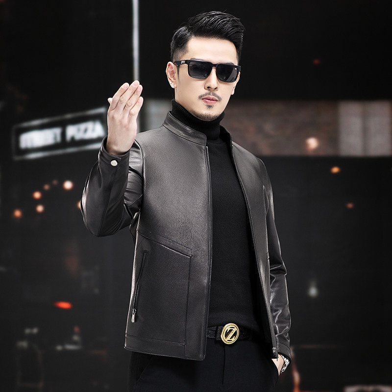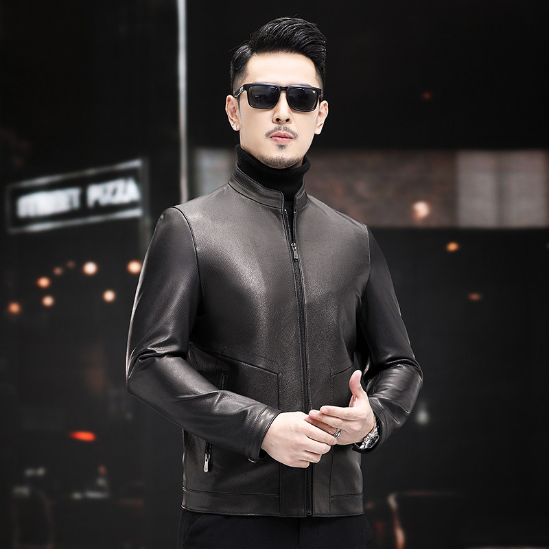 海宁真皮皮衣男士休闲山羊皮夹克,精选优质山羊皮材质,皮质柔软细腻,自然纹理清晰,彰显低调奢华质感。立领设计简约利落,兼具防风与时尚感,修身剪裁贴合身形,展现男士挺拔轮廓。整体线条流畅,细节做工精致,金属拉链顺滑耐用,袖口与下摆走线工整。百搭黑色或经典棕色,轻松驾驭商务休闲、日常出行等多种场合。源自“中国皮革之都”海宁,品质有保障。这款皮夹克不仅保暖防风,更以简约时尚的设计诠释现代男性魅力,是秋冬衣橱不可或缺的时尚单品。
