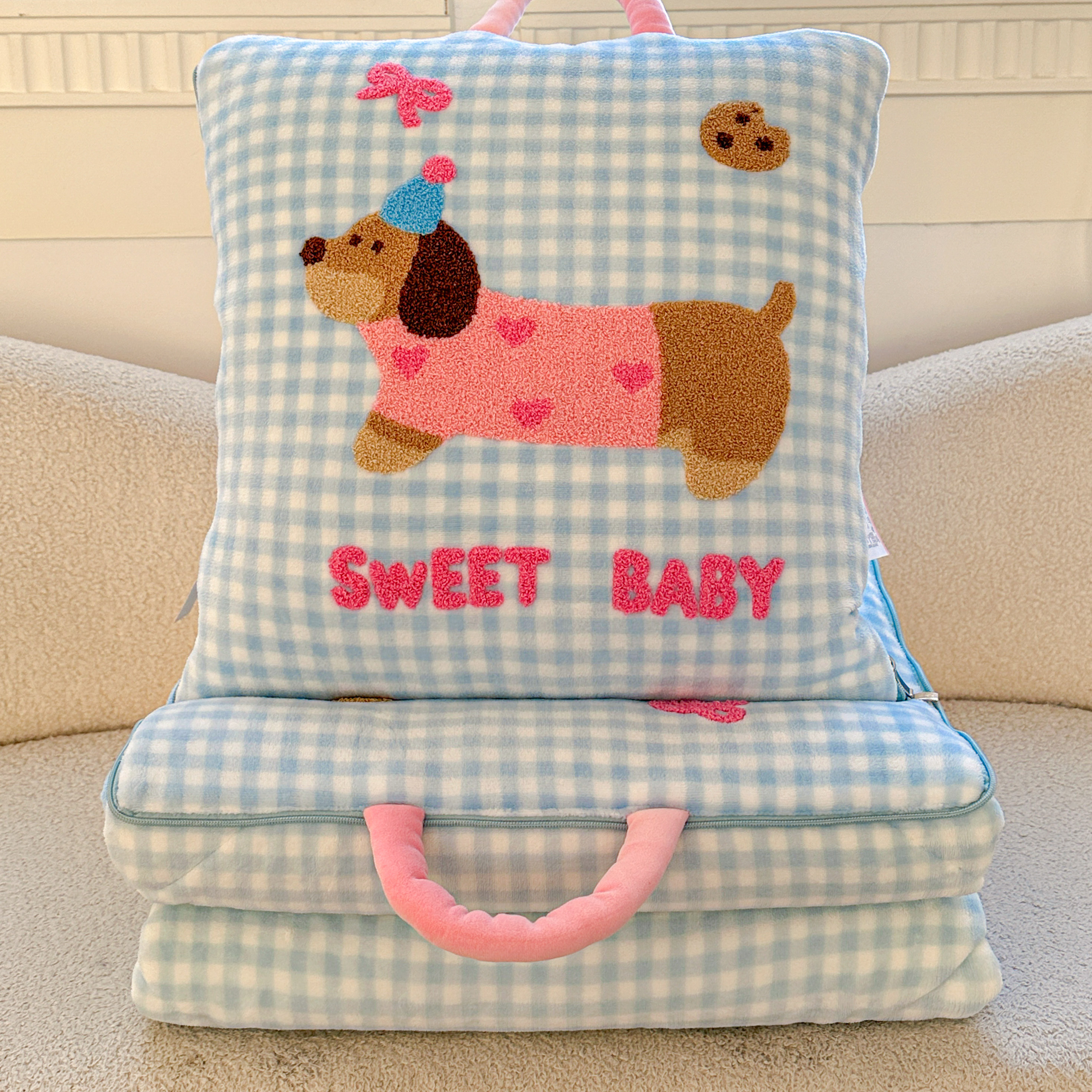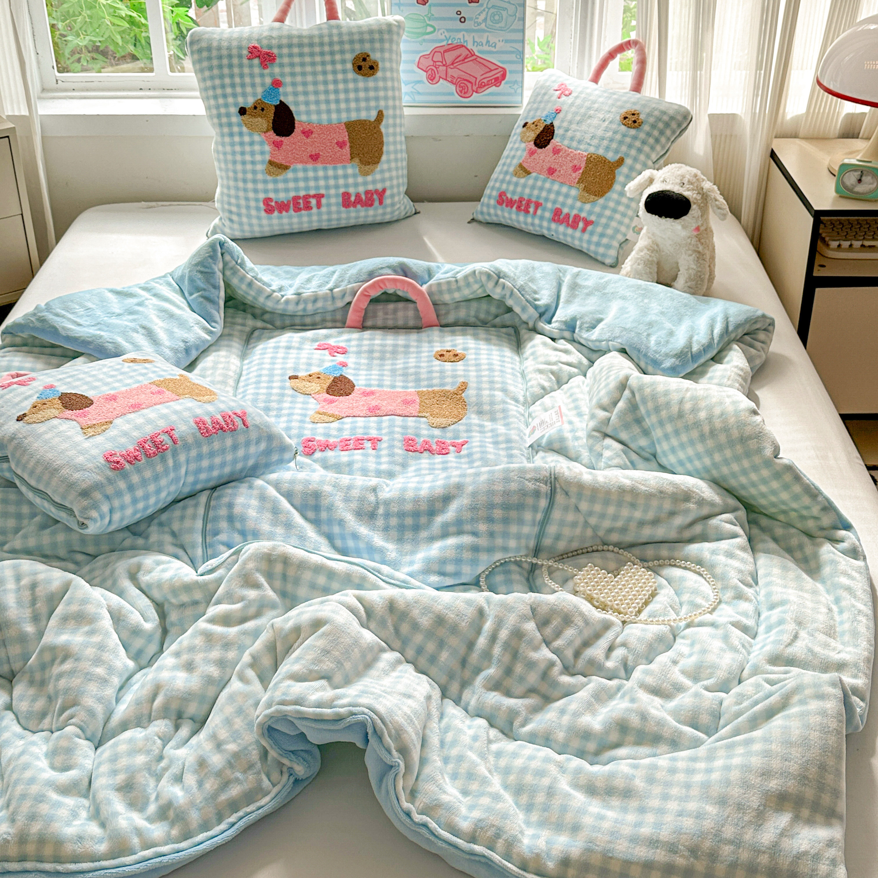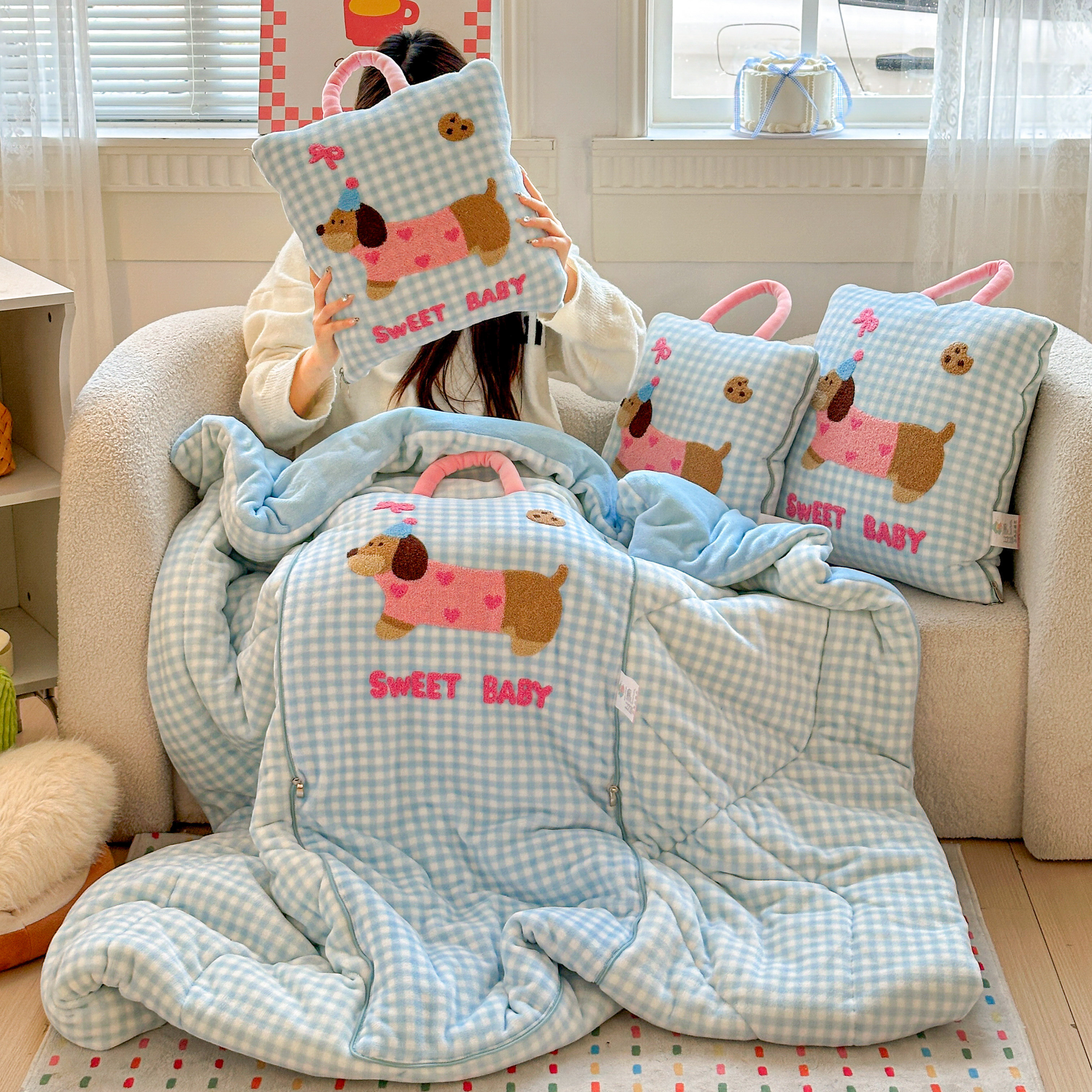 淘宝腊肠狗抱枕被子两用可爱汽车沙发盖毯加厚办公室学生宿舍午休被冬