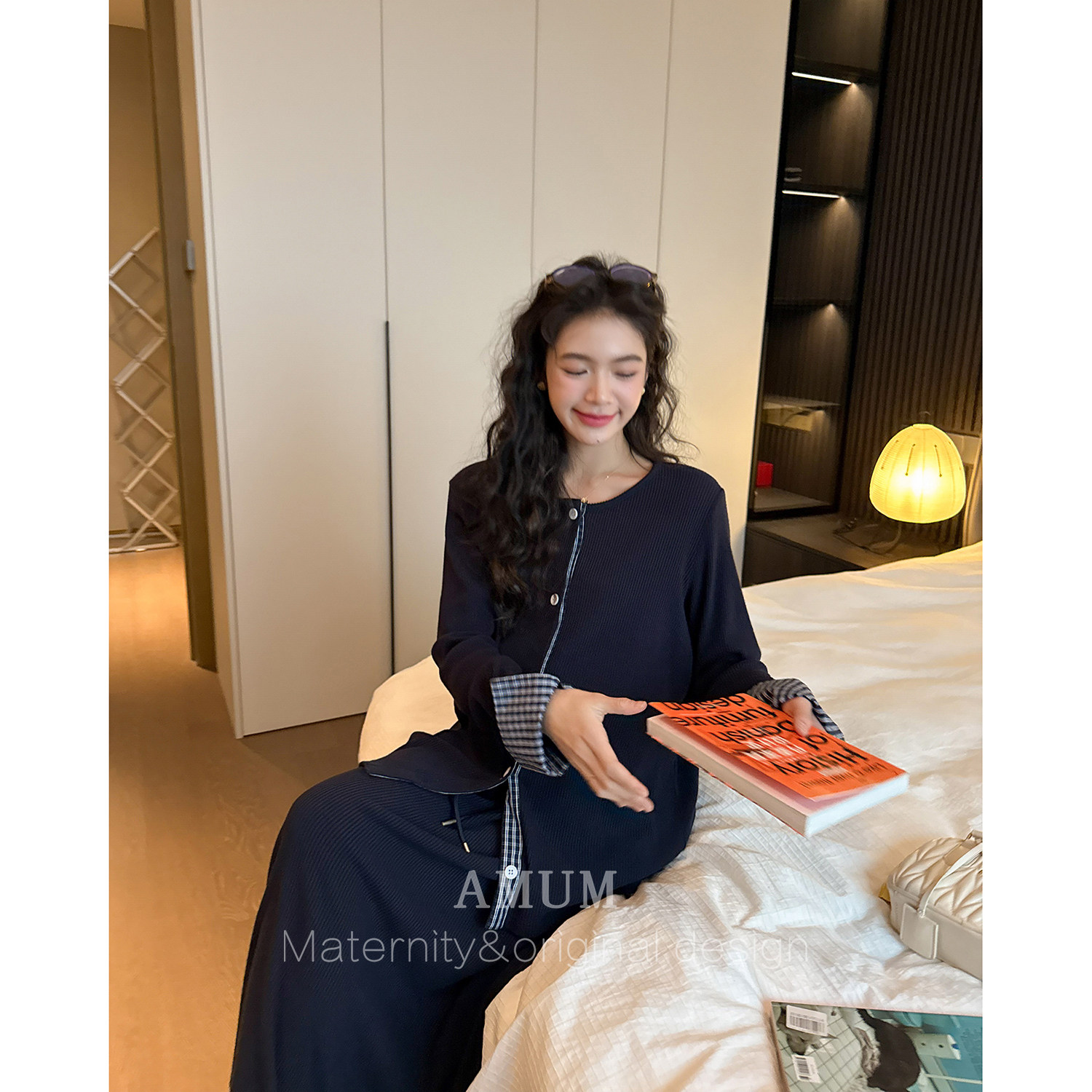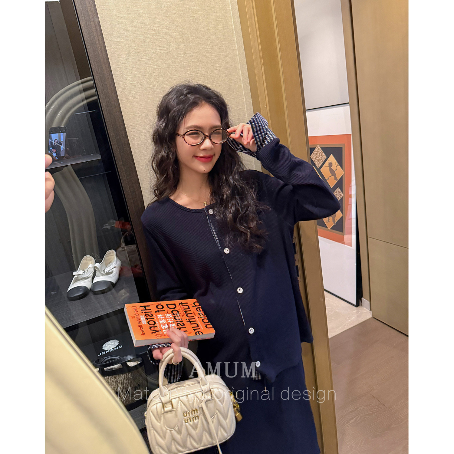 淘宝◆AMUM孕妇装◆智性温柔~气质藏青格子拼接袖开衫高腰半身裙套装