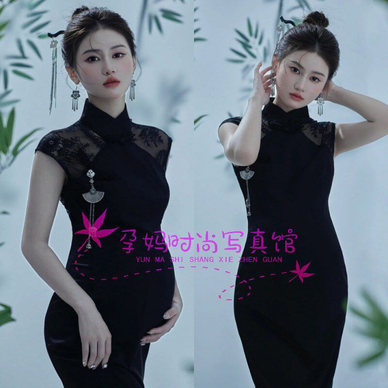 淘宝孕妇照服装新款影楼中国风中式复古黑色丝绒高级旗袍艺术拍照礼服