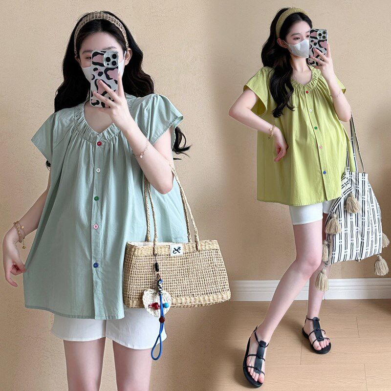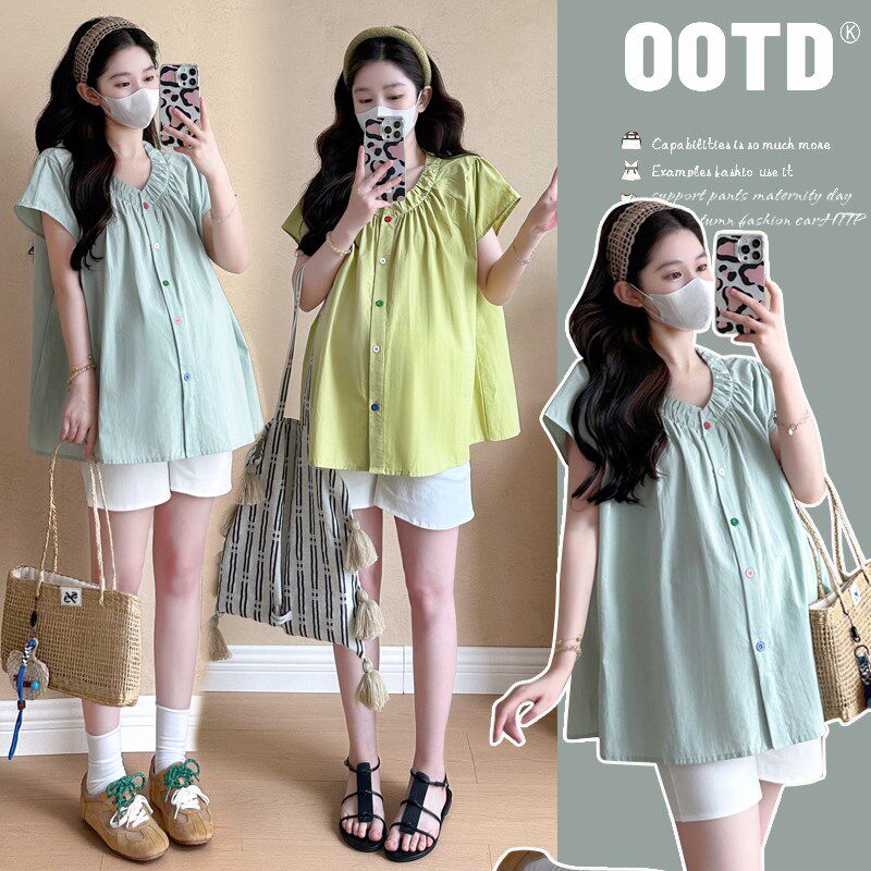 淘孕妇裙子夏装小清新气质减龄翻领轻薄遮肚衬衫长裙夏季短袖连衣裙