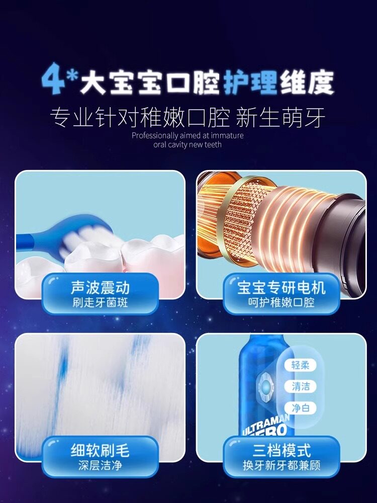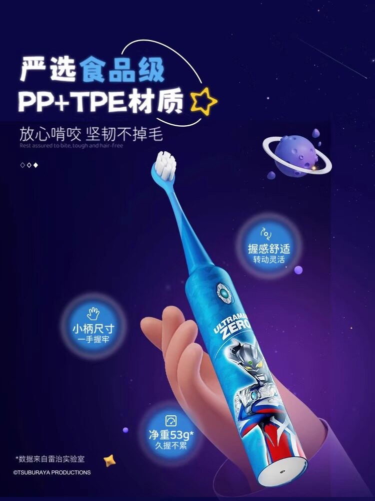 灵动创想赛罗奥特曼儿童电动牙刷,专为3-12岁宝宝设计,融合经典奥特曼卡通元素,激发孩子刷牙兴趣。采用柔软细密刷毛,温和清洁乳牙与牙龈,呵护稚嫩口腔。智能定时提醒功能,帮助养成科学刷牙习惯,每次2分钟,30秒换区提示。低分贝静音电机,减少宝宝恐惧感,使用更安心。IPX7级防水设计,全身可冲洗,安全便捷。配备多种趣味贴纸和奥特曼主题包装,让刷牙变成快乐时光。适合不同年龄段儿童,是孩子口腔护理的理想选择,守护笑容,从“齿”开始。