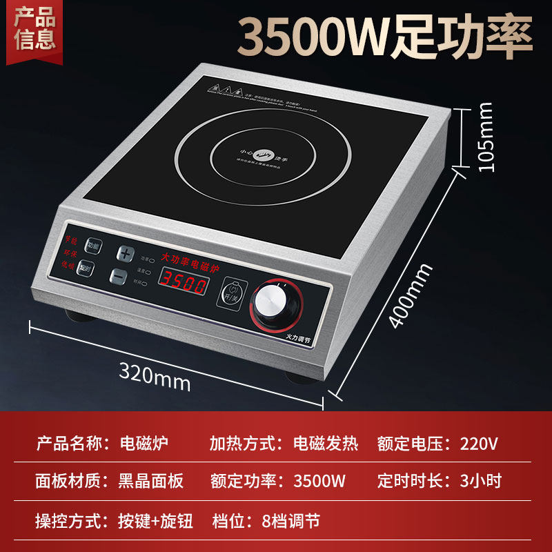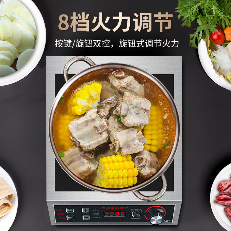 半球商用3500W大功率电磁炉,专为食堂、饭店等餐饮场所设计,具备高效节能、火力强劲的特点。采用优质微晶面板,支持凹面与平面双模式切换,适配不同锅具,满足煮汤、卤肉、炒菜等多种烹饪需求。部分型号功率可达5000W,升温迅速,控温精准,大幅提升出餐效率。内置多重安全保护(过温、过压、干烧防护),操作简便,耐用性强。其坚固结构与专业散热设计,确保长时间高负荷稳定运行,是商用厨房的理想选择,兼顾性能与安全,助力餐饮高效运营。