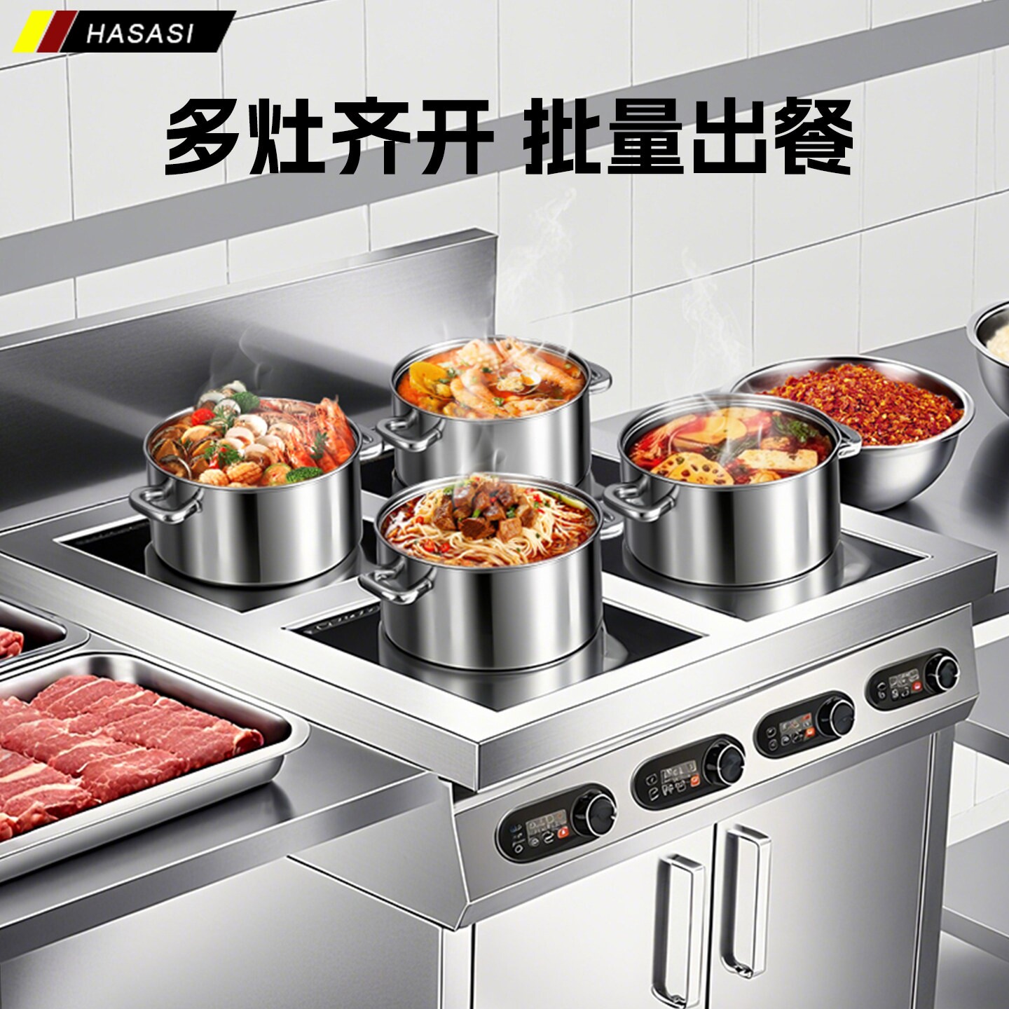 哈萨斯商用电磁炉是一款专为餐饮行业设计的高效节能灶具,具备多头大功率配置,支持四头、六头、八头等多种组合,满足不同规模厨房需求。采用先进的电磁感应加热技术,单头功率高达3500W,加热迅速、火力强劲,可精准控温,适用于煲仔、炒菜、炖煮等多种烹饪方式。炉面采用耐高温微晶玻璃,坚固耐用且易清洁。具备0W待机功能,节能环保。智能安全保护系统包括过热保护、干烧报警和自动断电,确保使用安全。结构紧凑、操作简便,是餐厅、食堂、酒店等商用厨房的理想选择,兼顾高效、安全与耐用性。