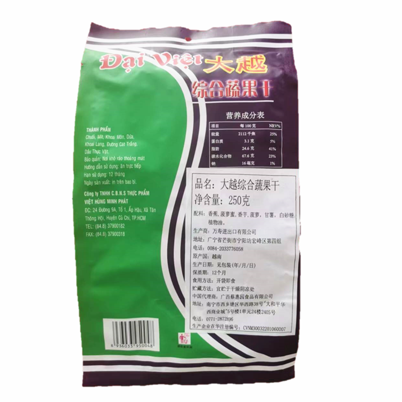 越南进口大越综合蔬果干250g,精选优质新鲜蔬果,采用先进低温脱水工艺,最大程度保留原果营养与天然风味。产品包含香蕉、菠萝、红薯、紫薯等多种蔬果,口感酥脆香甜,无添加防腐剂,健康又美味。大粤蔬果干混合装,色彩缤纷,营养丰富,是日常休闲、办公解馋、旅行携带的理想零食。250g大容量包装,满足全家分享需求,越南直采,品质有保障。现包邮促销,性价比极高,让您足不出户尽享东南亚天然美味。无论是孩子零食还是成人健康小食,都是安心之选,开启清爽酥脆的味蕾新体验。