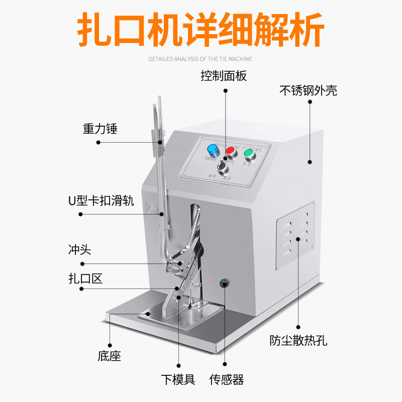 火腿肠电动感应脚踏打扣机是一款高效、智能的包装封口设备,广泛应用于食品加工、食用菌栽培及面包包装等行业。该机采用电动感应与脚踏双重控制模式,操作简便、响应迅速,可精准完成U型卡扣封口,确保密封牢固、外观整洁。适用于火腿肠、面包袋、食用菌菌袋等多种软包装材料的快速扎口作业。设备结构紧凑,运行稳定,支持连续工作,大幅提升包装效率,降低人工成本。其不锈钢材质机身符合食品卫生标准,清洁维护便捷,是现代食品与农业生产企业提升自动化水平的重要辅助工具。