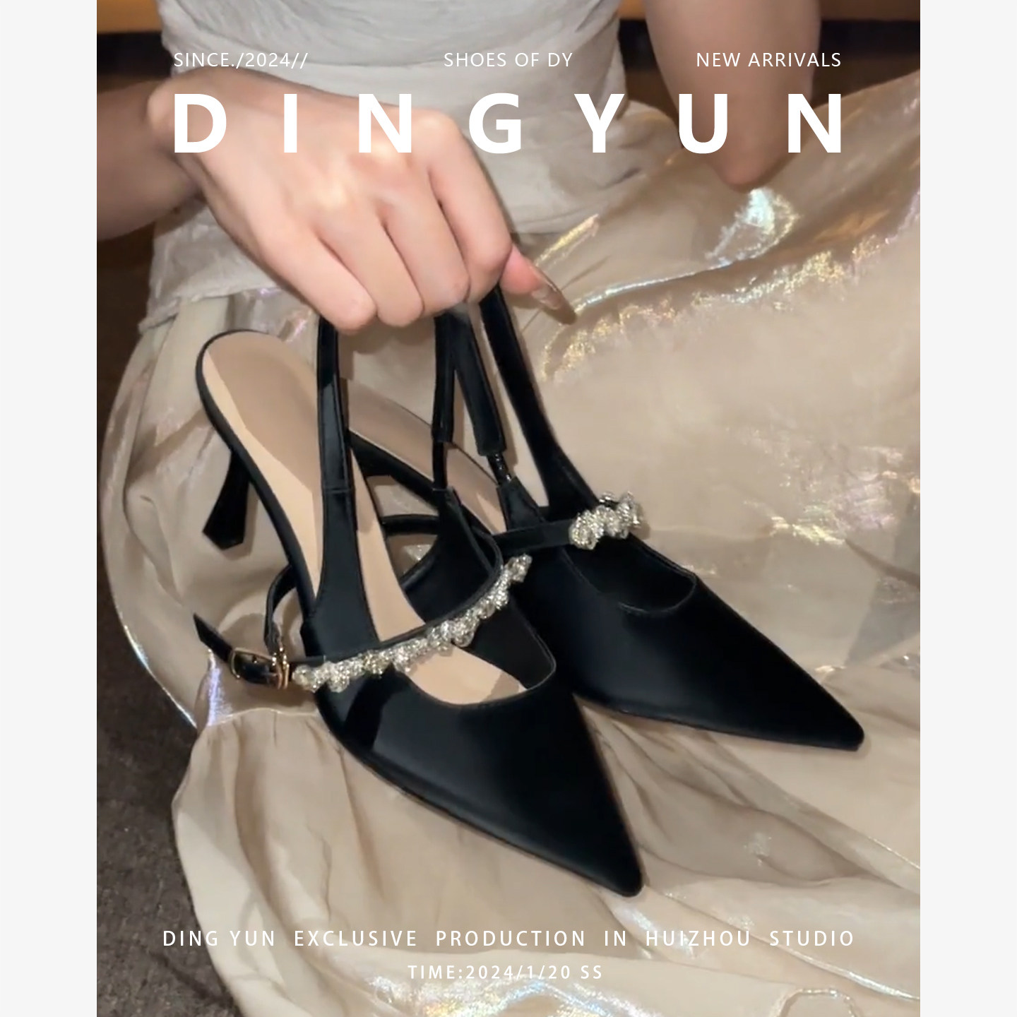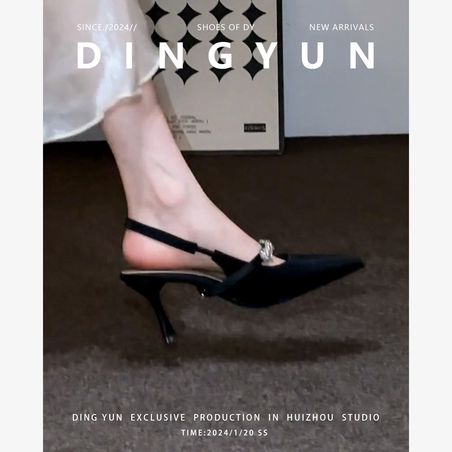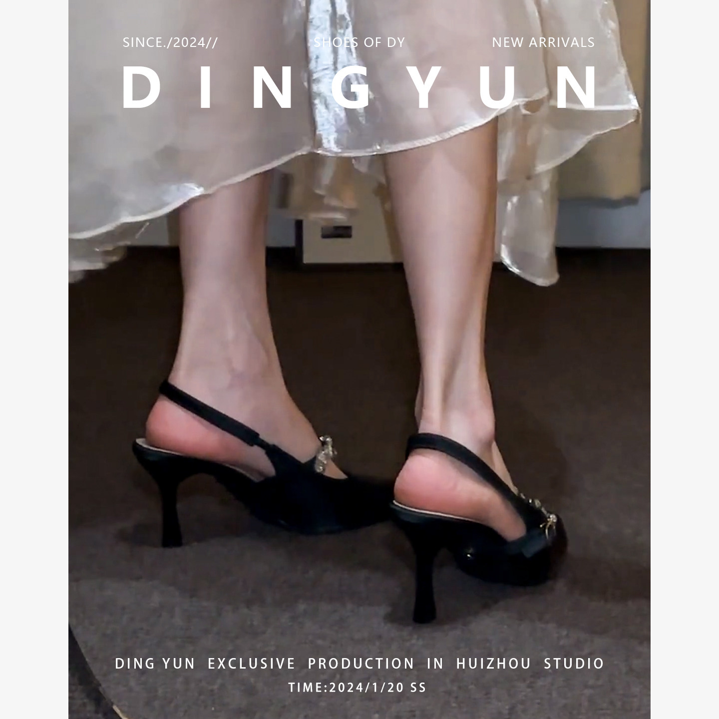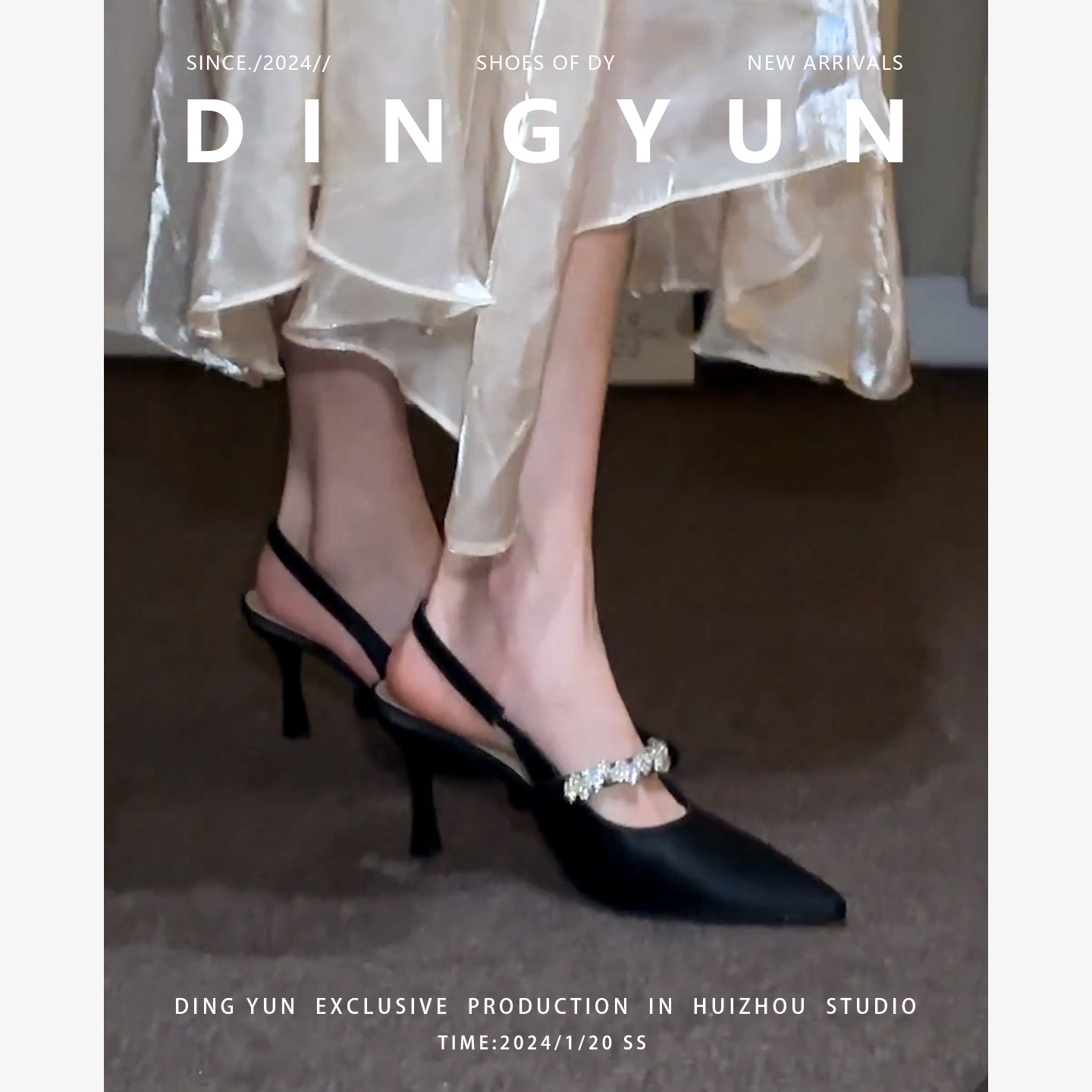 淘宝丁允dingyun法式包尖头高细跟鞋女新款一字水钻凉鞋半拖夏季外穿